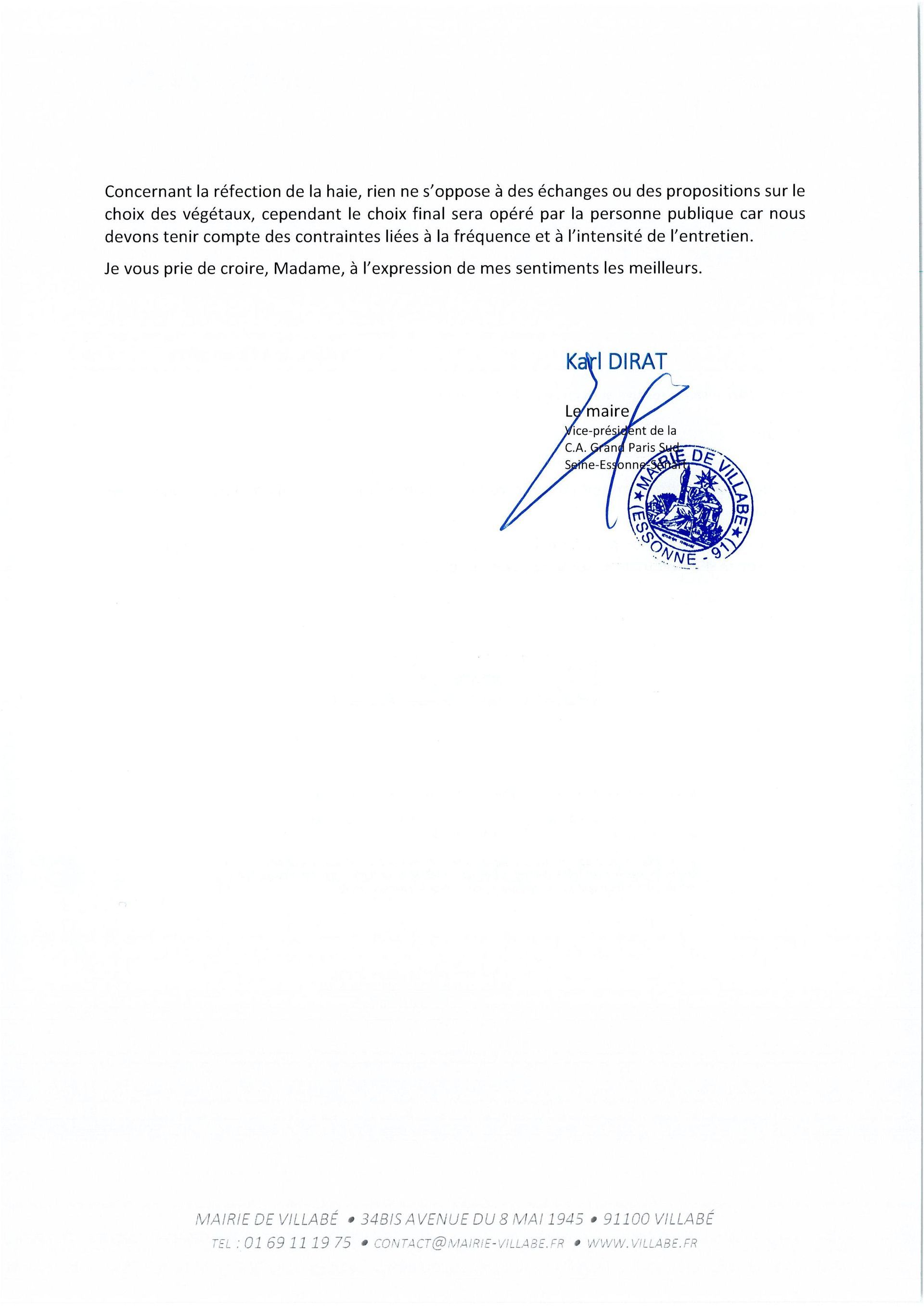 « …Concernant la réfection de la haie, rien ne s’oppose à des échanges et des propositions sur le choix des végétaux, cependant le choix final sera opéré par la personne publique car nous devons tenir compte des contraintes liées à la fréquence et à l’intensité de l’entretien… »