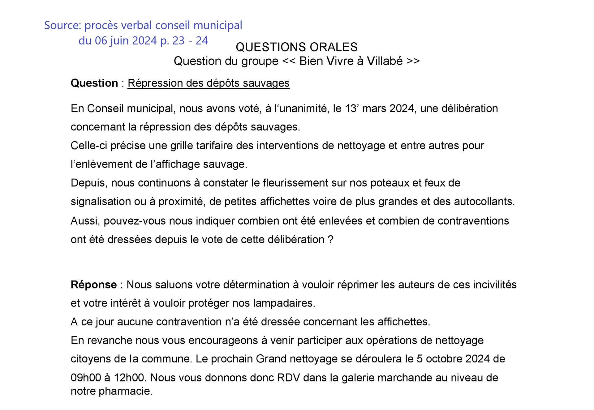 Ayant constaté le fleurissement sur nos poteaux, feux de signalisation ou à proximité, de petites affichettes voire plus grandes et des autocollants, nous avons souhaité savoir si la délibération adoptée à l’unanimité en mars 2024 était appliquée. Nous avons donc demandé le nombre de contraventions dressées …