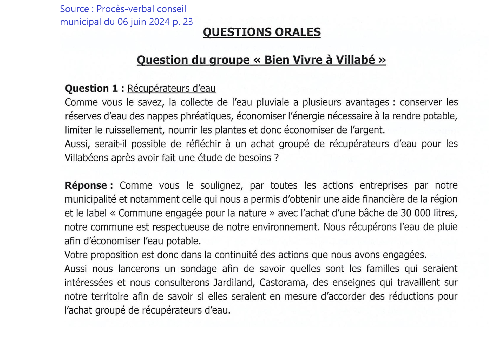 Nous avons proposé de réfléchir à un achat groupé de récupérateurs d’eau pour les Villabéens après avoir fait une étude de besoins …et le maire en est d’accord … dont acte !