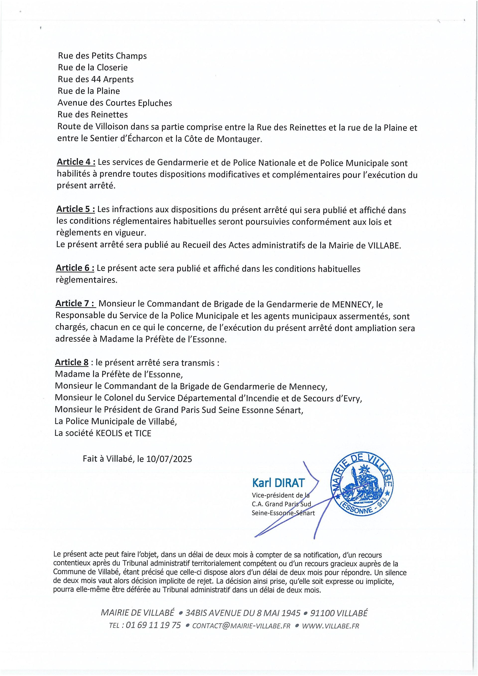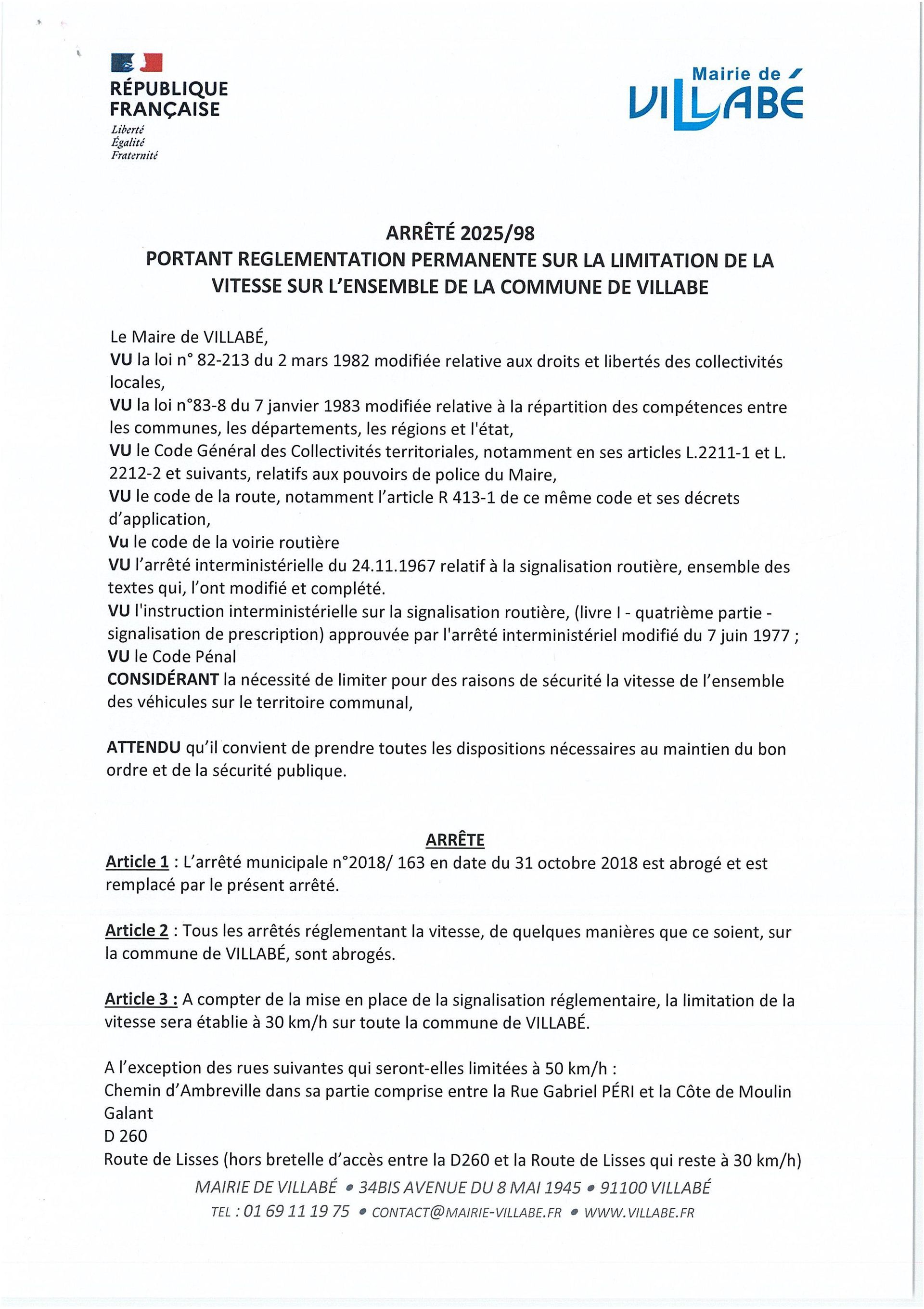Arrêté municipal pris le 10 juillet : limitation de vitesse dans Villabé