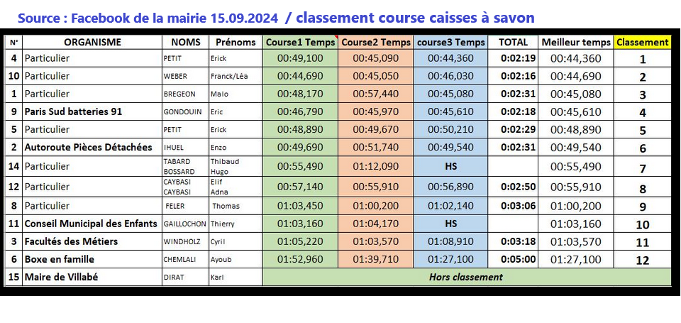 Il n’y a eu que 13 participants à la course (cf. classement) et non 20…Parmi eux 2 élus, 2 entreprises, 1 association, 1 CFA et 7 particuliers de Villabé ou pas !