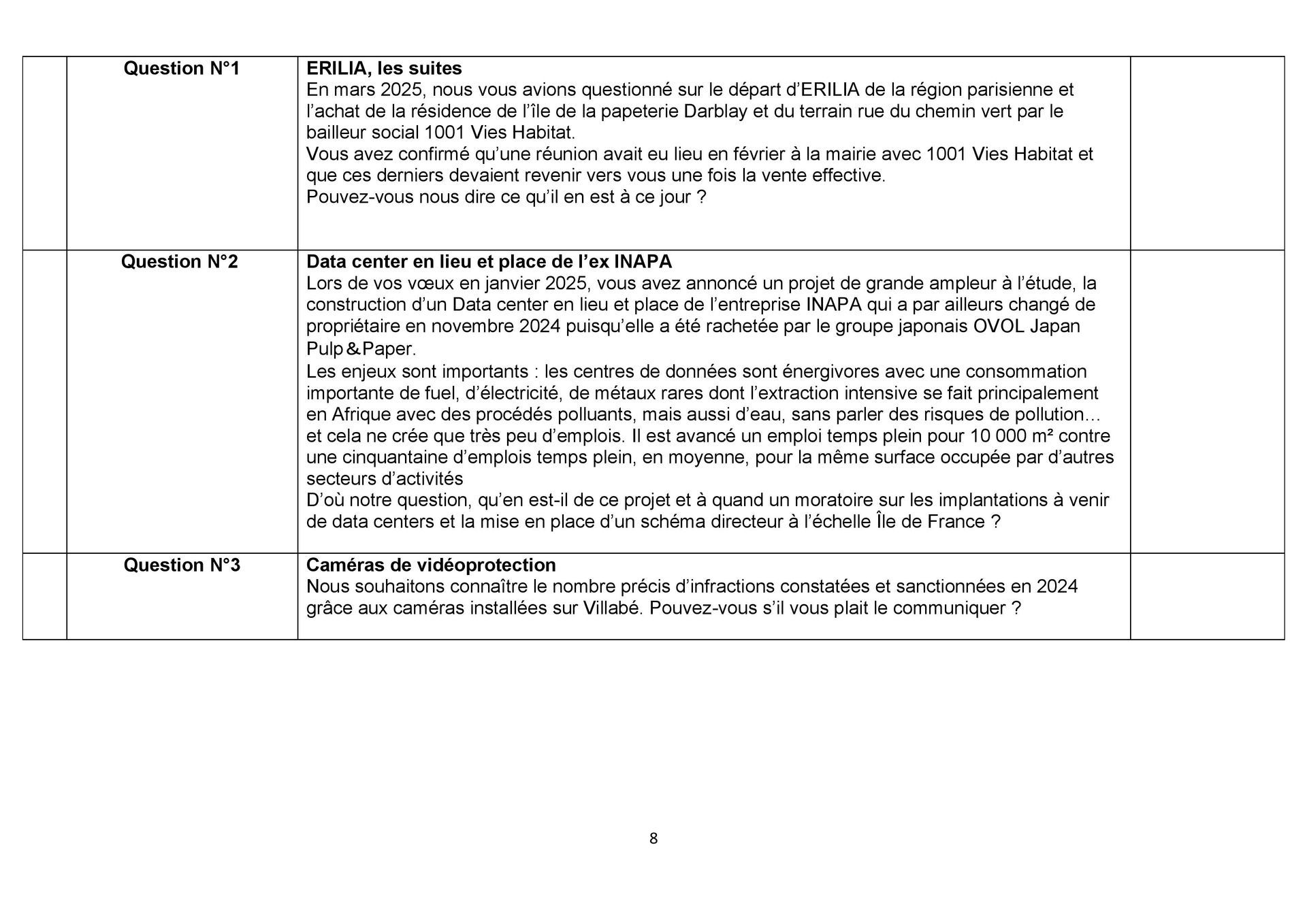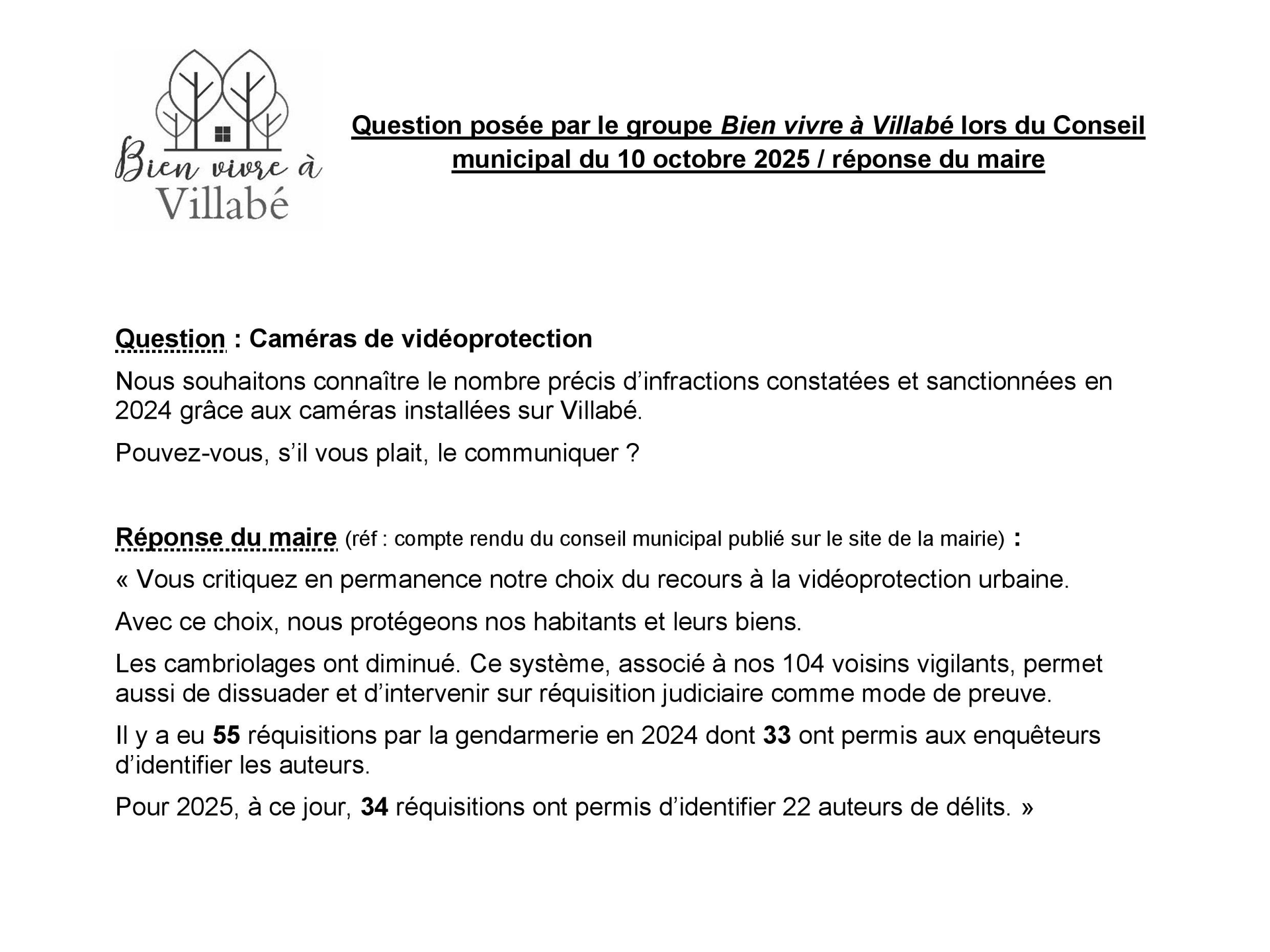 Il est grandement temps de se questionner sur l’utilisation de ce système de vidéoprotection et d’envisager une autre politique en matière de sécurité, en réaffectant les moyens prévus pour l'installation de nouvelles caméras afin d'assurer une présence physique, au quotidien, de la police municipale dans Villabé !
