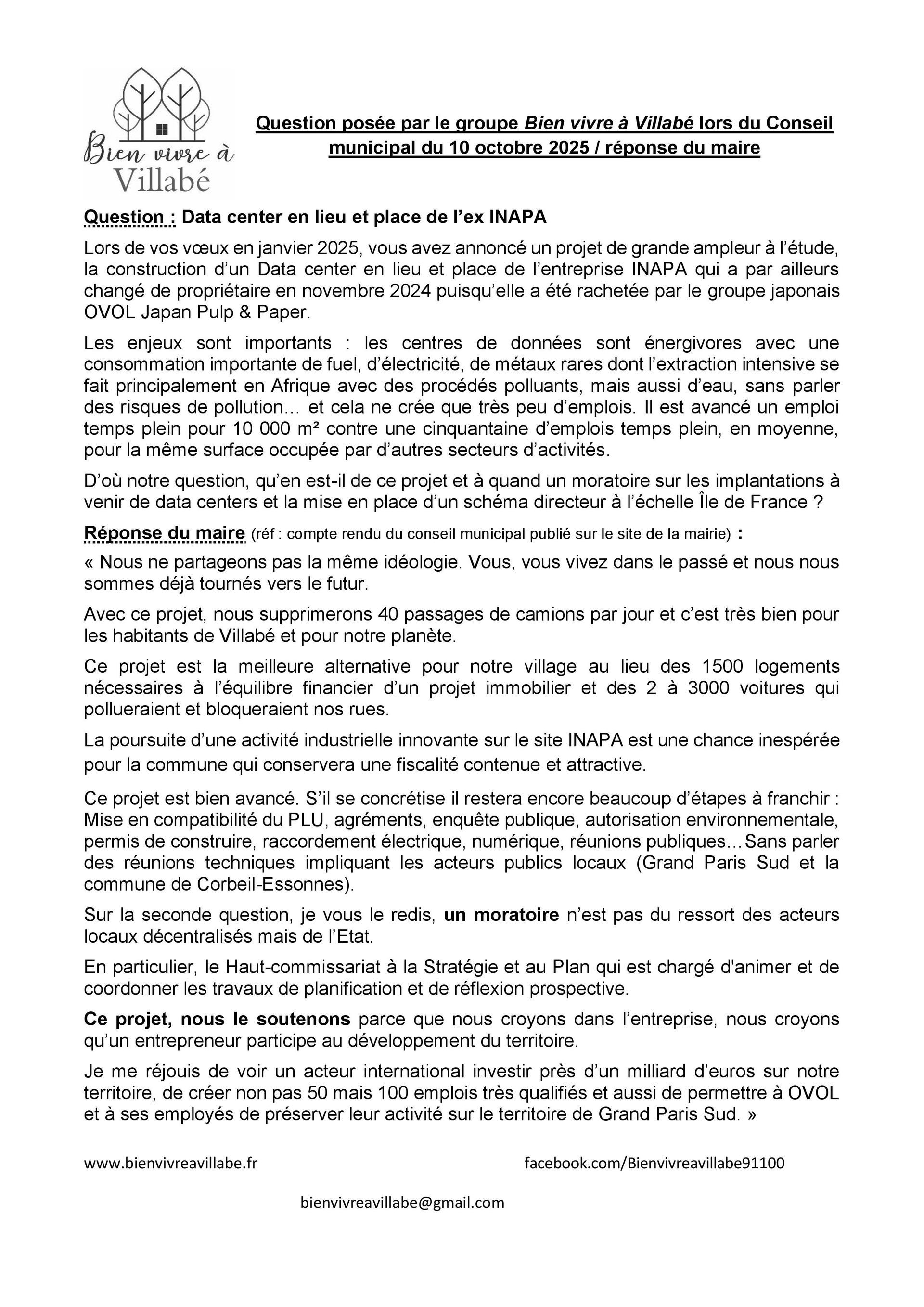 Contrairement à la majorité municipale, le groupe Bien vivre à Villabé continue à s’interroger sur ce projet qui serait le 3ème dans un petit périmètre Corbeil-Essonnes/Le Coudray, Lisses. Il n’est pas le seul puisque l’agglomération Grand Paris Sud travaille sur une doctrine et une stratégie relative aux projets de data centers avec une grille de critères d’analyse pour définir les conditions de mise en œuvre.