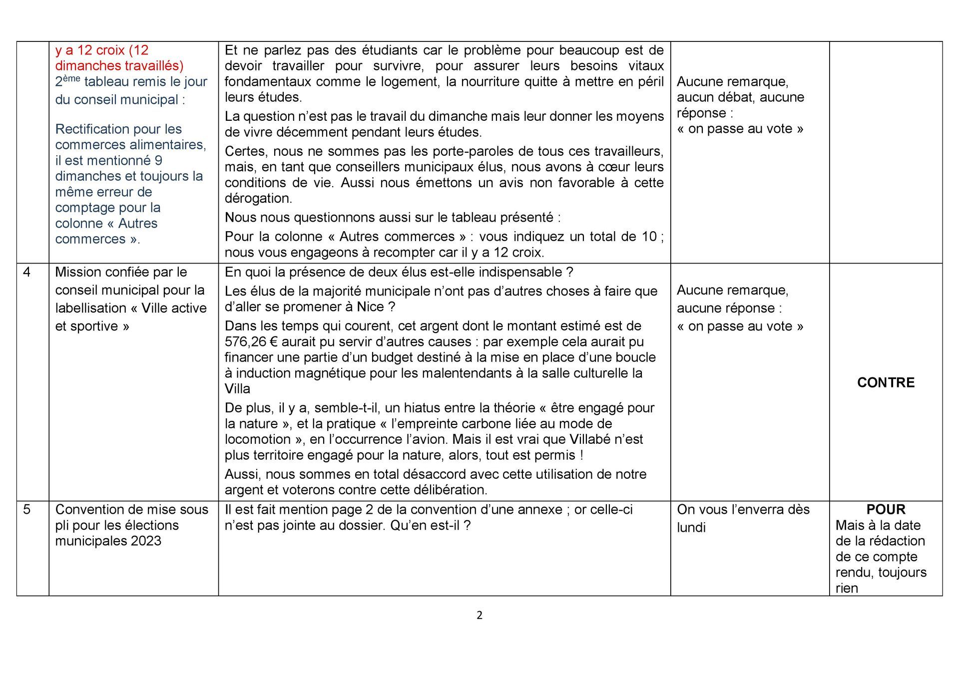du Plan Local d’Urbanisme, le départ de 2 conseillers municipaux à Nice (un adjoint et une déléguée) etc.