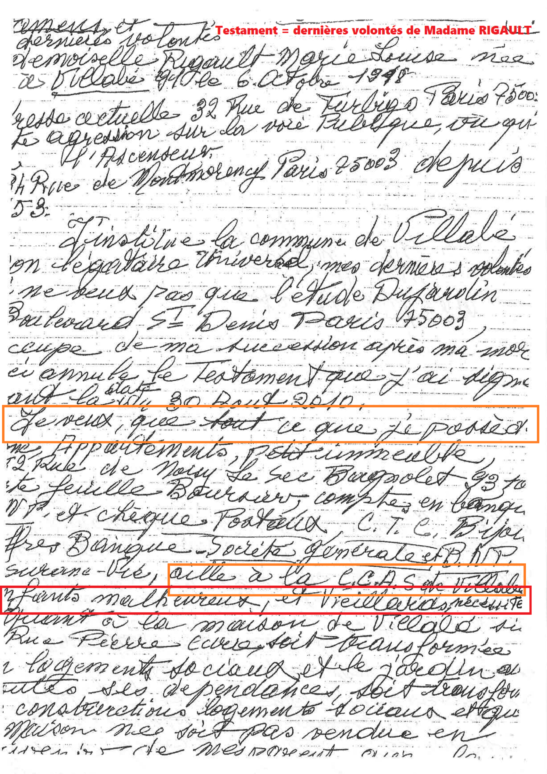 « Je veux que tout ce que je possède …aille à la CCAS de Villabé, enfants malheureux, et vieillards nécessiteux »