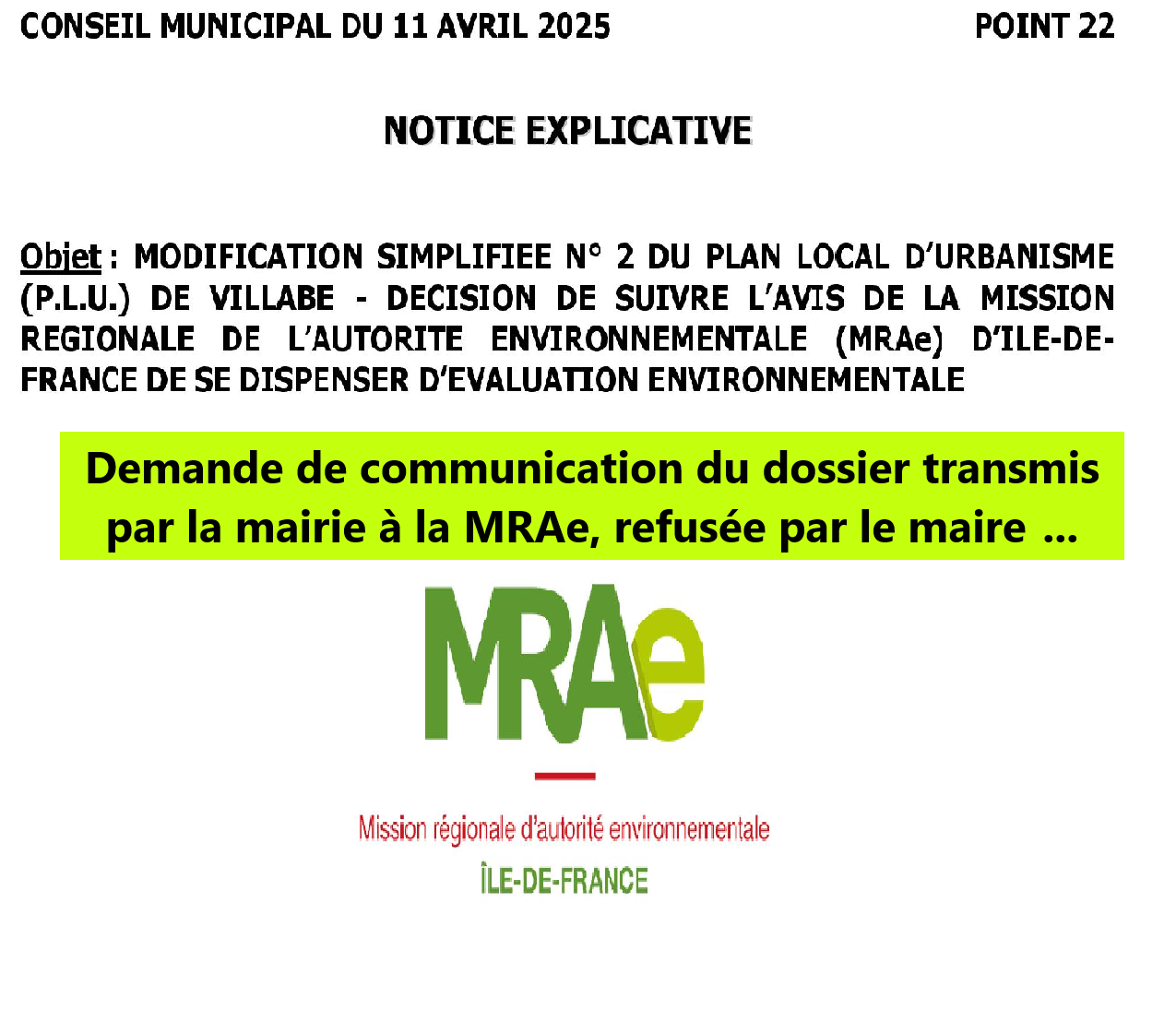 *Lesdites pièces ont conduit la MRAe à émettre un avis conforme concluant à l’absence de nécessité d’une évaluation environnementale de la modification simplifiée n°2 du plan local d’urbanisme de Villabé après examen au cas par cas. Référence chaîne You Tube de la mairie / conseil municipal du 11 avril 2025 / temps 1 :50 :26 / point 22