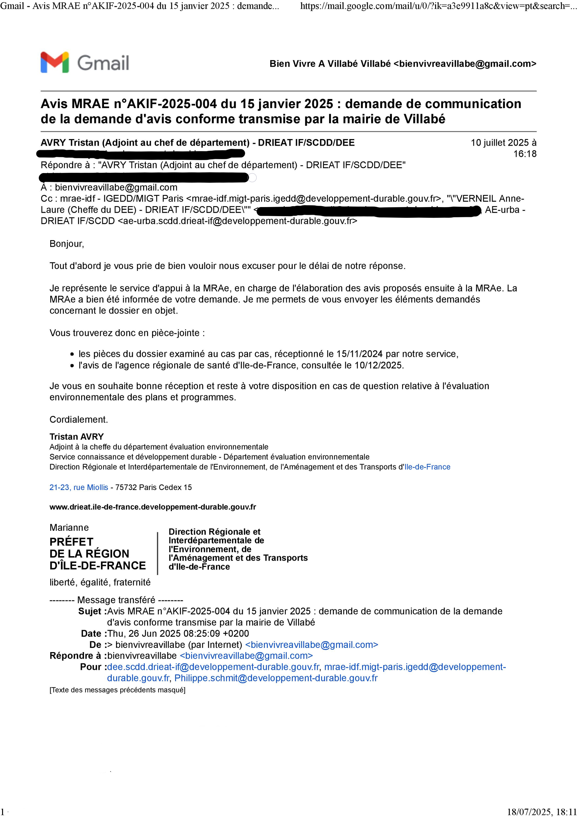 Le 22 avril, les conseillers municipaux de Bien vivre à Villabé demandent par courrier au maire la communication des pièces transmises par la mairie à la Mission Régionale d’Autorité environnementale (MRAe) d’île de France, le 15 novembre 2024*.