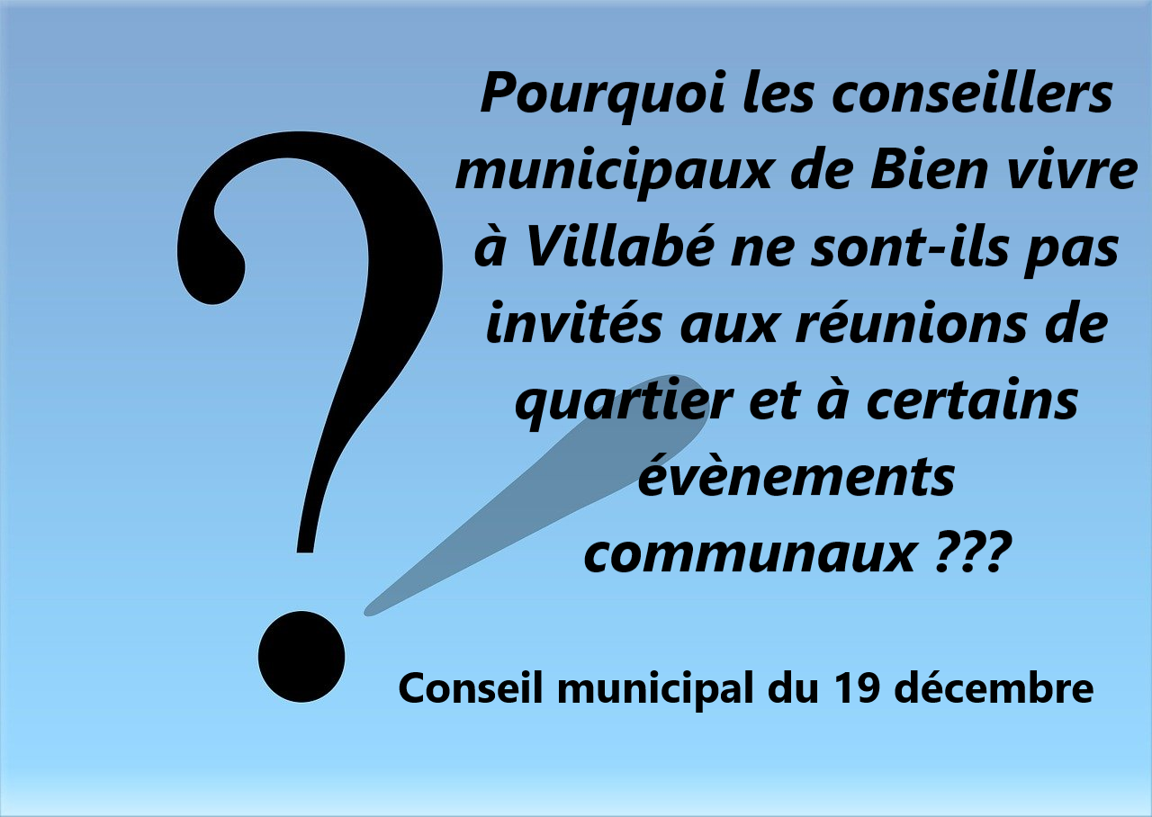 Toutefois, cela ne répond pas à la question posée : pourquoi les conseillers municipaux de Bien vivre à Villabé ne sont-ils pas invités à bon nombre d’évènements communaux ? À votre avis ?