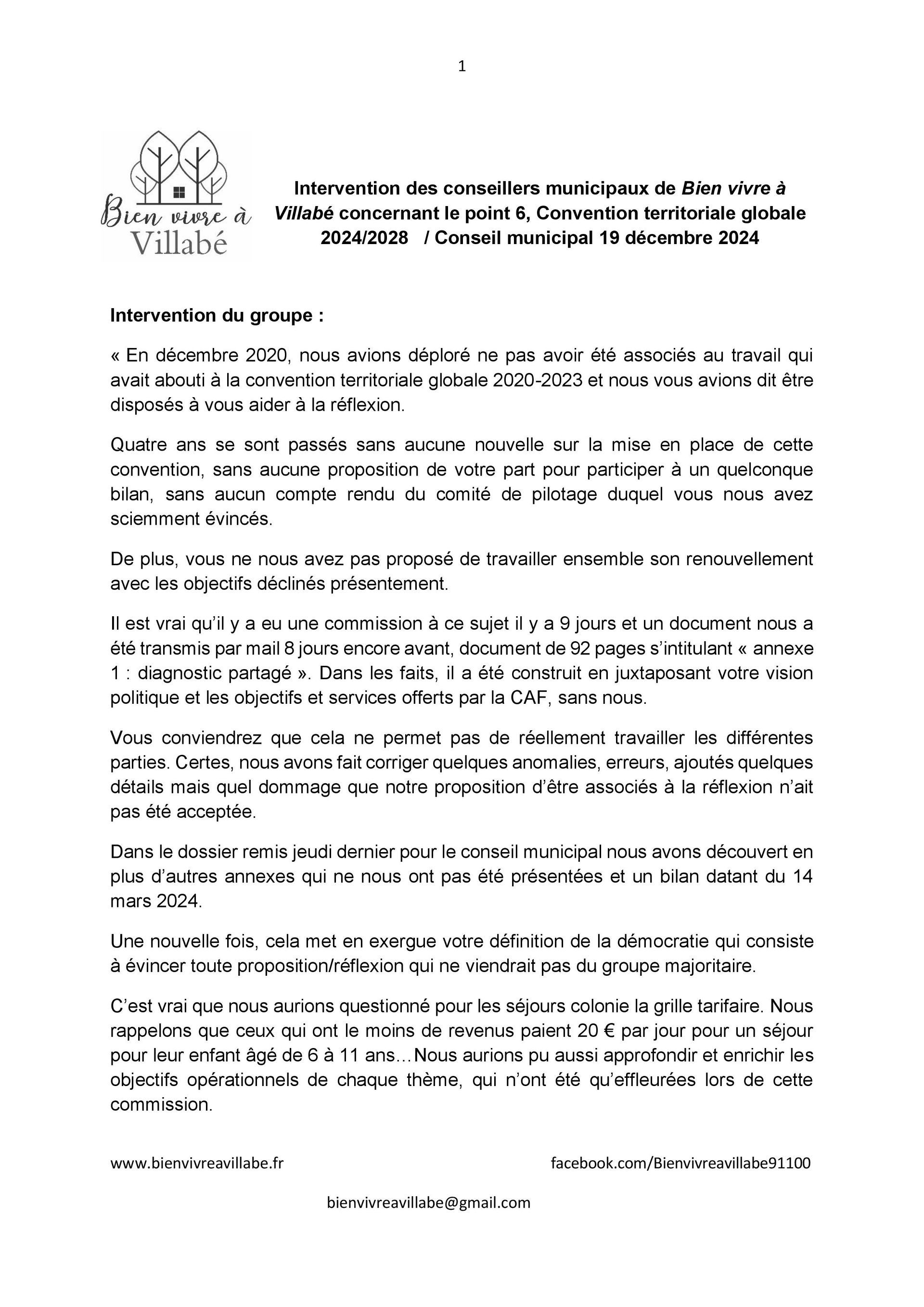 Par principe, ils refusent que les dossiers puissent être travaillés en commission comme par exemple celui de la convention territoriale globale. C’est bien dommage quand nous savons que deux des conseillers municipaux du groupe Bien vivre à Villabé ont des connaissances sur les différents thèmes abordés dans cette convention …