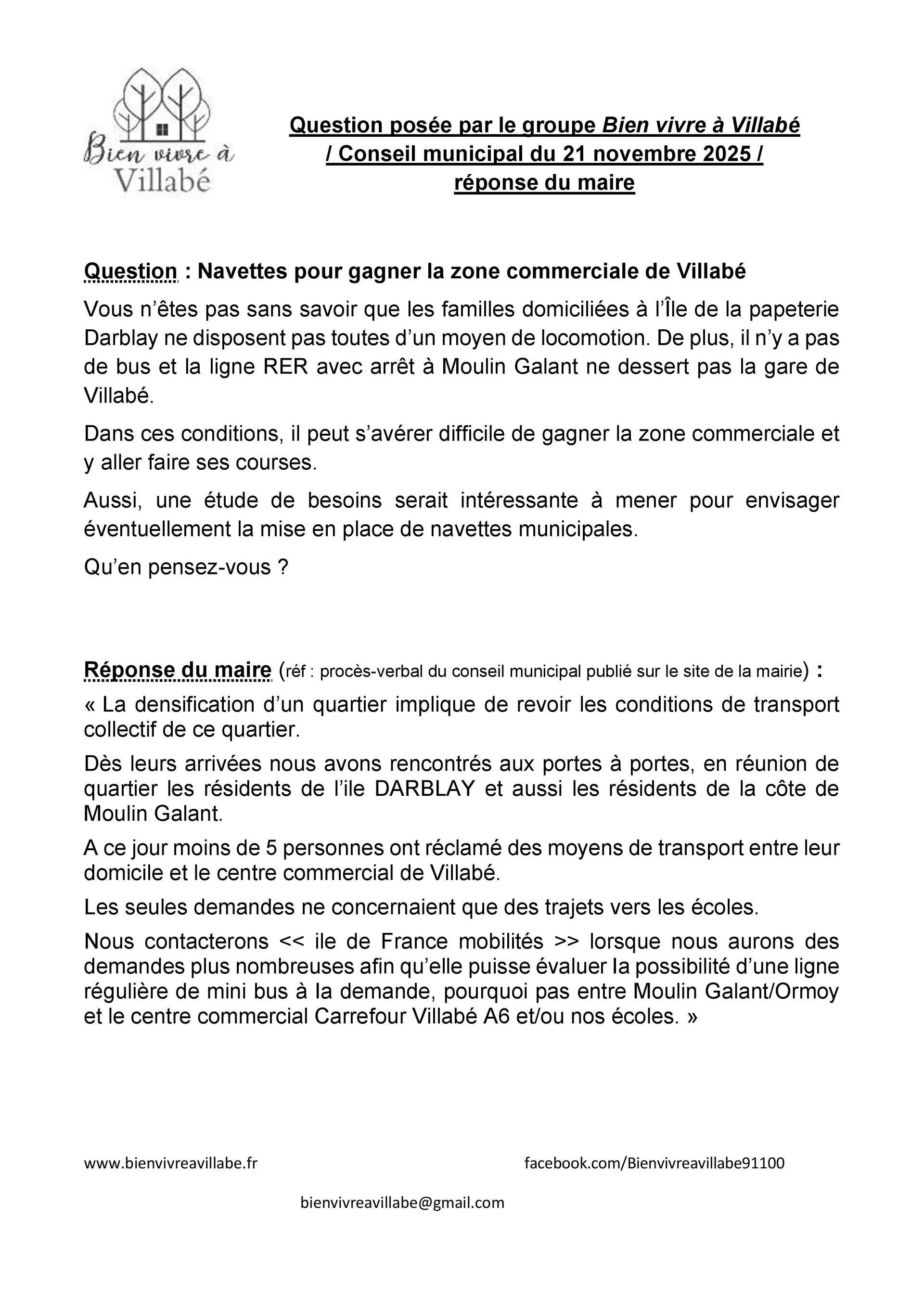 C’est pourquoi, si vous nous confiez la gestion de Villabé en mars 2026, nous proposerons de rouvrir ce dossier, de récolter des informations « Quoi ? Qui ? Où ? Quand ? Comment ? Combien ? Pourquoi ? » pour pouvoir être force de proposition auprès d’Île de France mobilités et/ou envisager des navettes municipales.