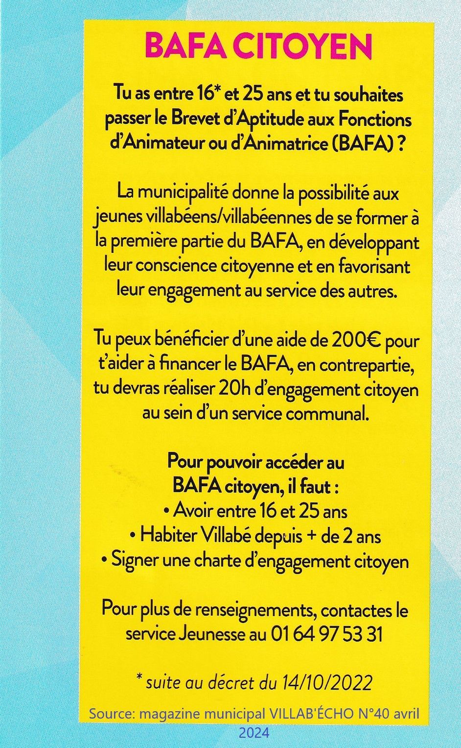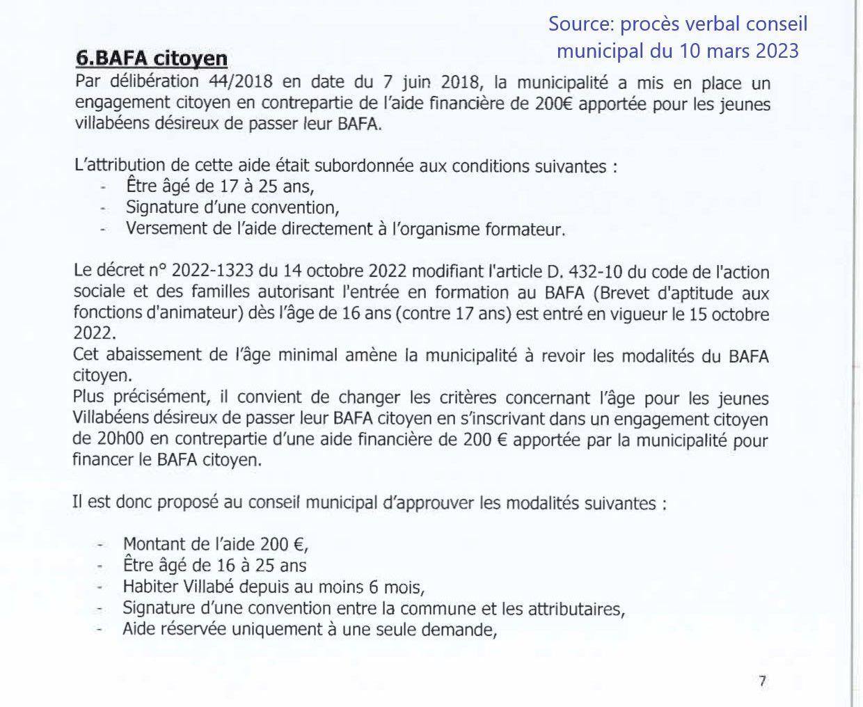 Nous évoquons l’encadré page 34 du dernier magazine municipal Villab’Échos d’avril 2024 qui évoque le BAFA Citoyen.