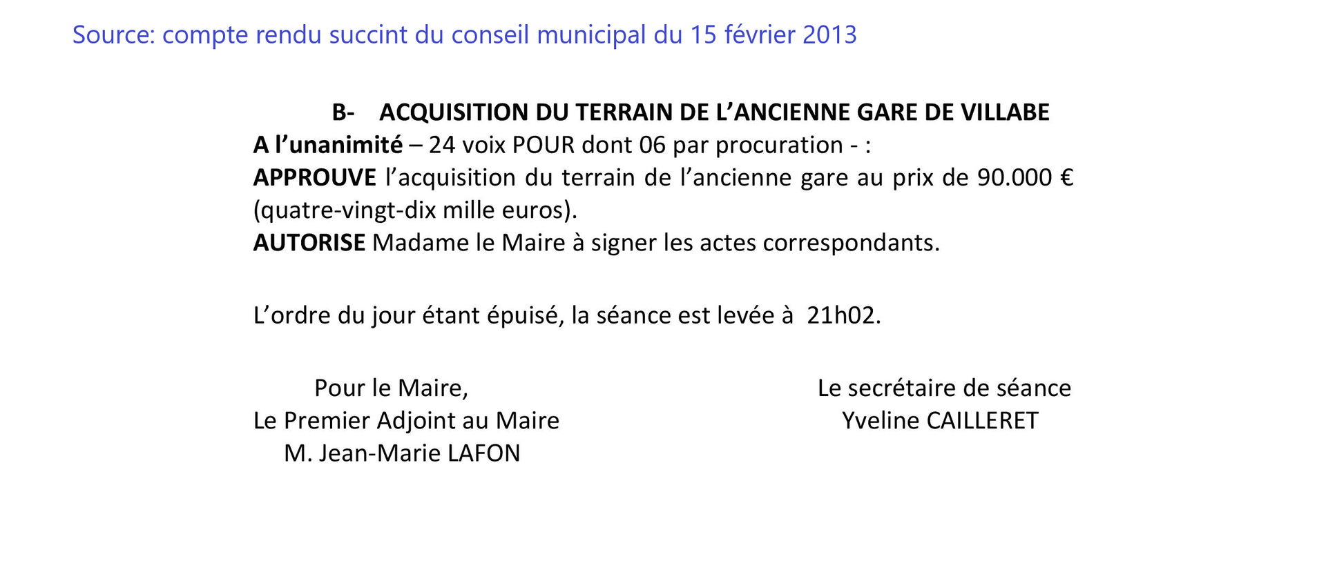 Alors pourquoi dire que le groupe ment alors que l’acquisition du terrain avec l’ancienne gare de Villabé au prix de 90 000 € date du 15 février 2013, avant qu’il ne soit élu ? (Cf. pièce jointe ci-dessous). Cet achat était bien lié à un projet d’intérêt général ? ? Que la gare devienne un musée du train ou une maison des associations.