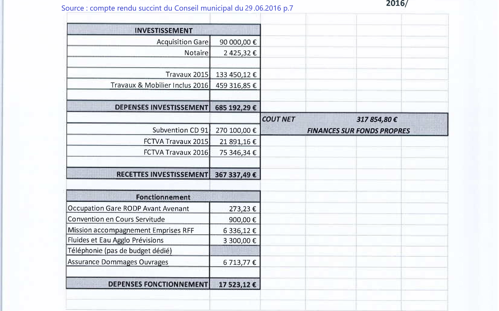 Bien évidemment, le terrain contient la vieille gare … et nous en avons confirmation si l’on s’en réfère au tableau présenté en conseil municipal le 26 juin 2016 (Cf. pièce jointe ci-dessous) où il est indiqué l’acquisition de la gare :