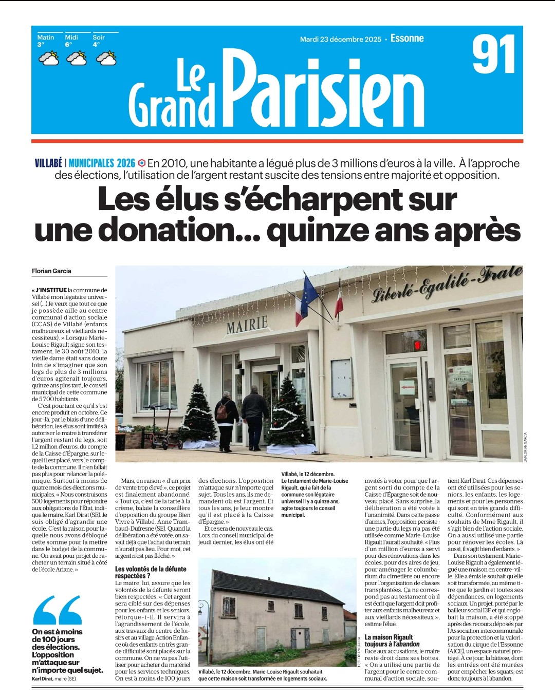 Mais, que cela leur plaise ou non, les conseillers municipaux du groupe Bien vivre à Villabé ont rappelé les dernières volontés de la défunte qui, normalement les lient à l’utilisation de ce legs :