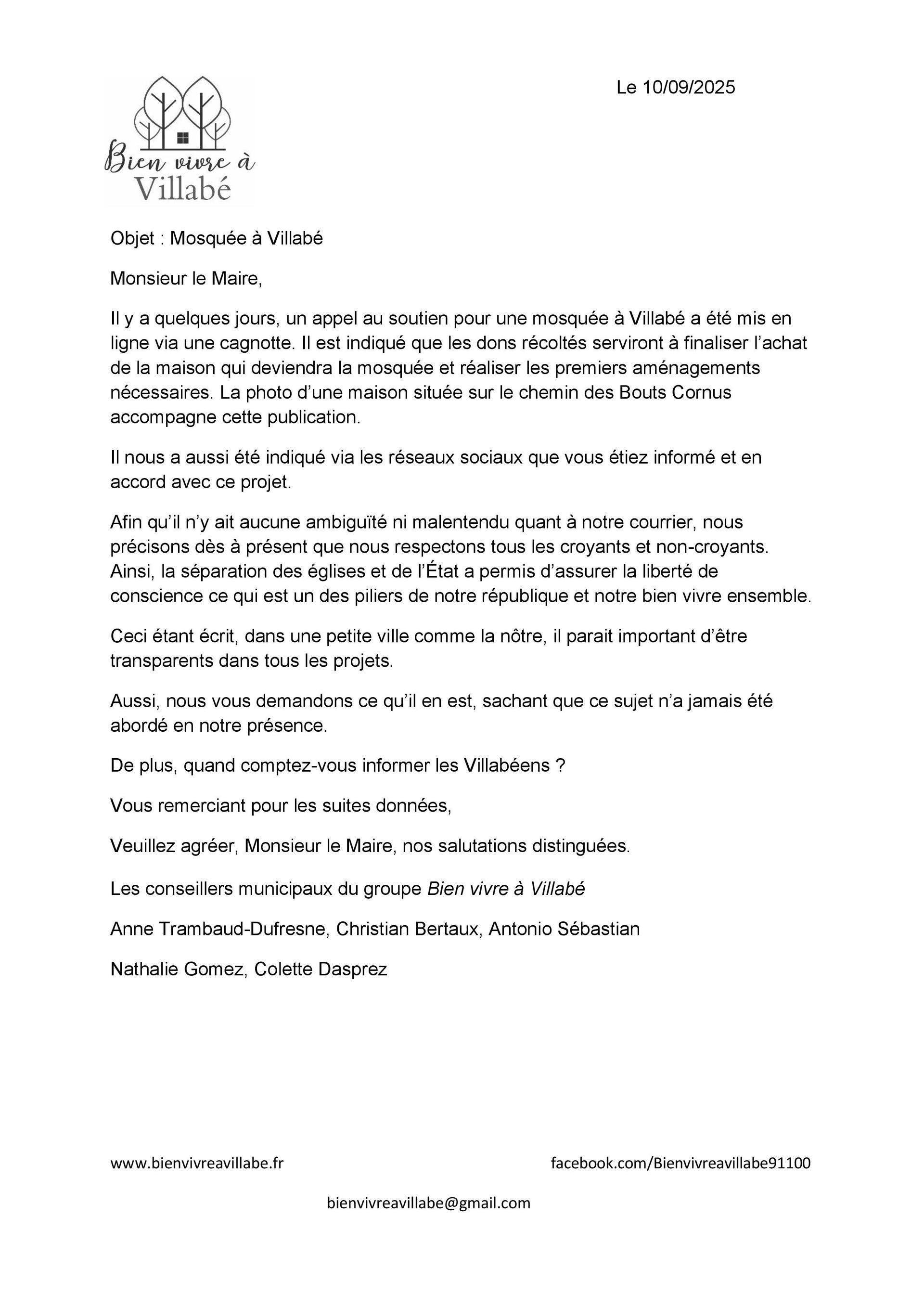 Nous, nous n’aurions pas attendu d’être « au pied du mur » pour informer/associer les Villabéens et nous espérons une prompte réponse, au maximum dans le délai d’un mois prévu par le règlement intérieur du conseil municipal, au courrier ci-dessous.