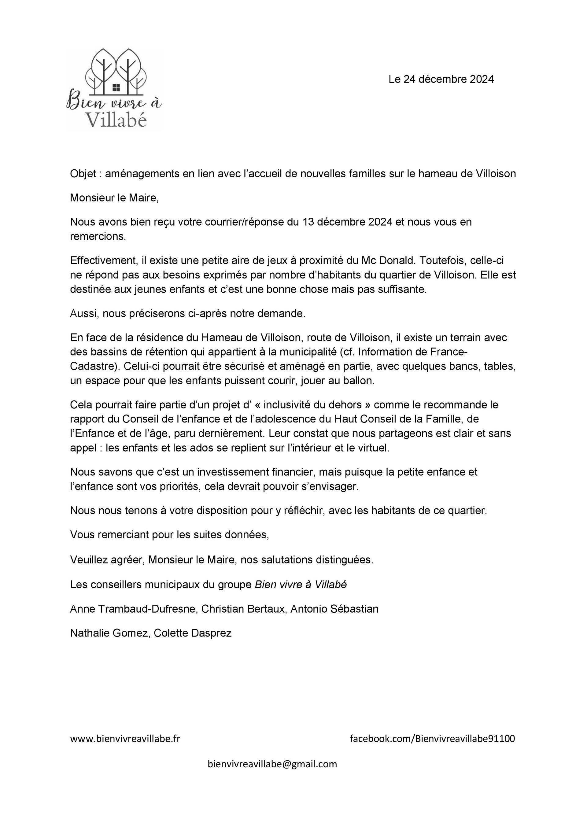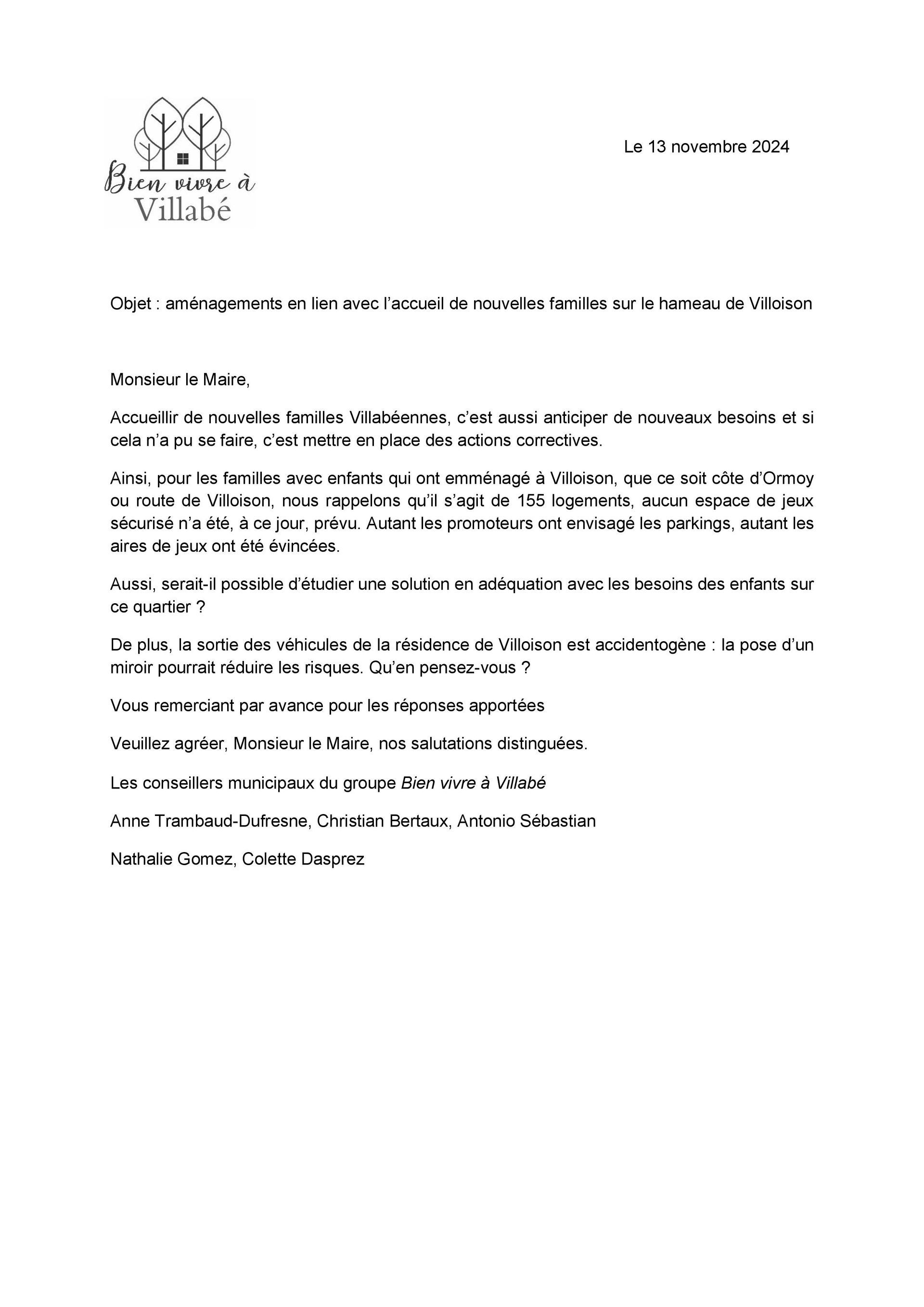Parce que nous sommes à l’écoute des Villabéennes et des Villabéens, nous avons transmis un courrier au maire lui demandant d’étudier une solution en adéquation avec les besoins des enfants sur le quartier du hameau de Villoison.