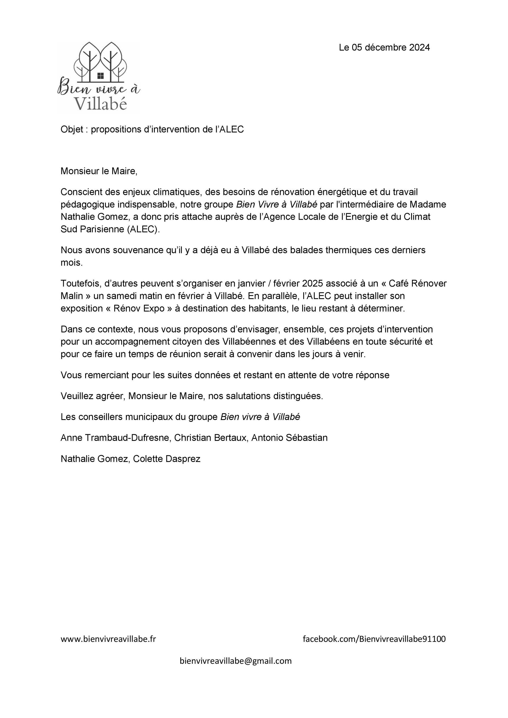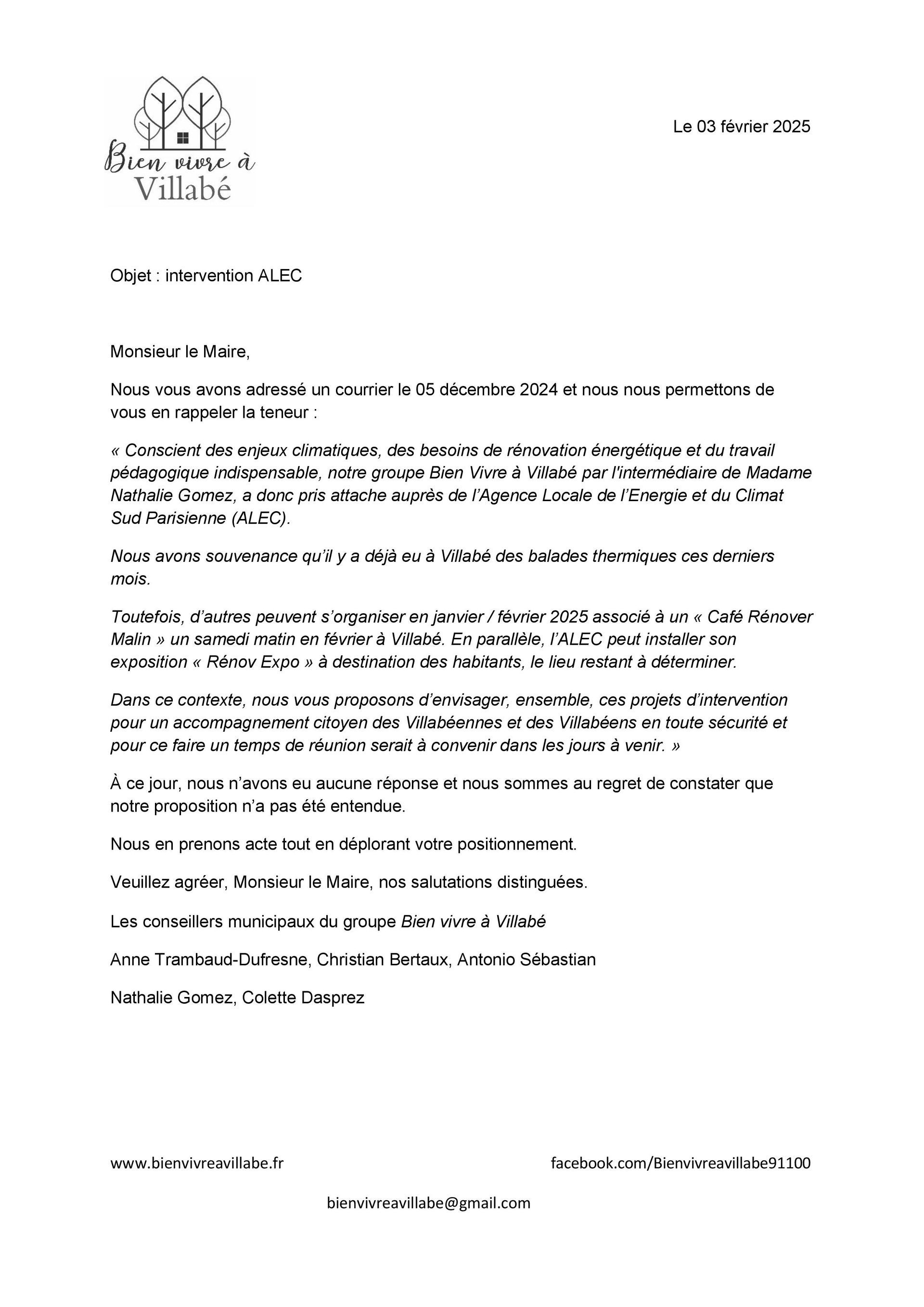 Le 5 décembre 2024, nous avons demandé au maire et à l’équipe majoritaire un temps de réunion rapidement pour envisager, ensemble, l’intervention de l’Agence Locale de l’Énergie et du Climat Sud Parisienne (ALEC) à Villabé.