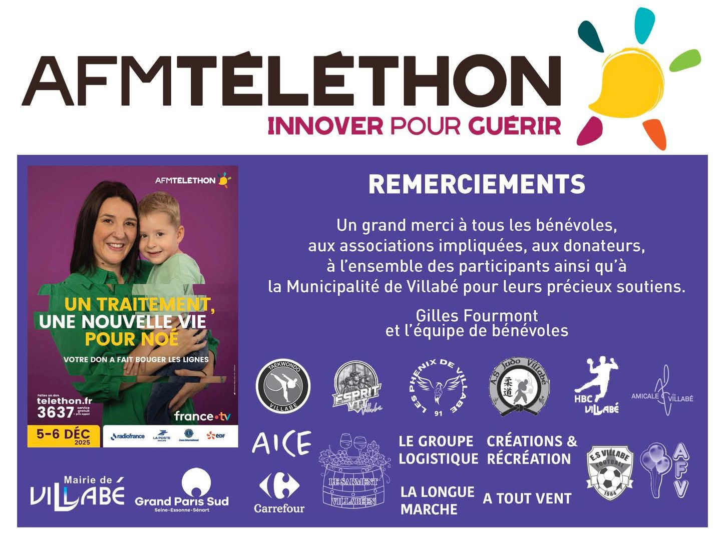 Pourtant, le Téléthon, organisé par l’association française contre les Myopathies (AFM) est un évènement caritatif important pour financer des projets de recherche : une équipe de bénévoles, composée de beaucoup d’associations villabéennes le fait vivre sur notre territoire, aidée par la mairie du point de vue logistique.