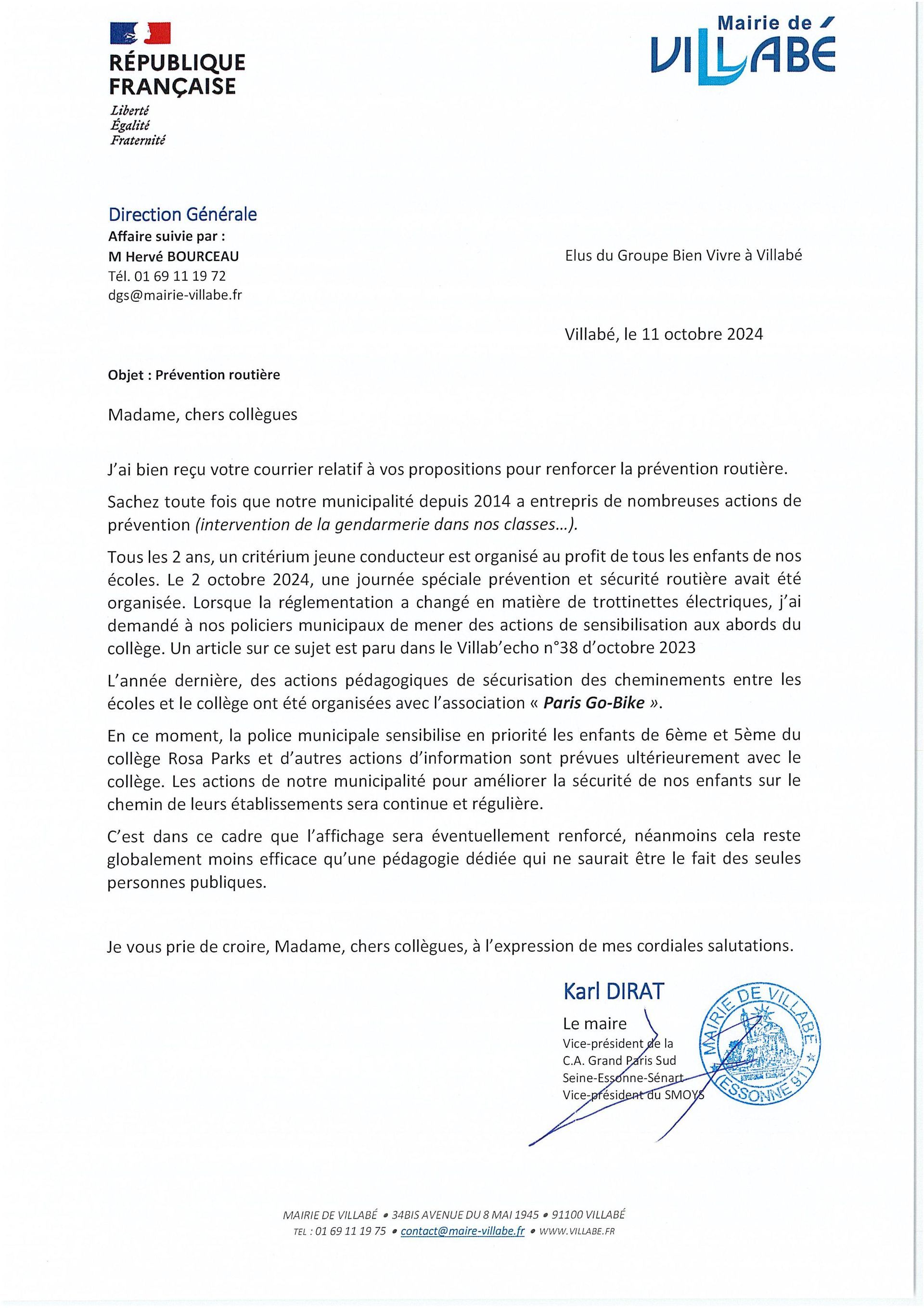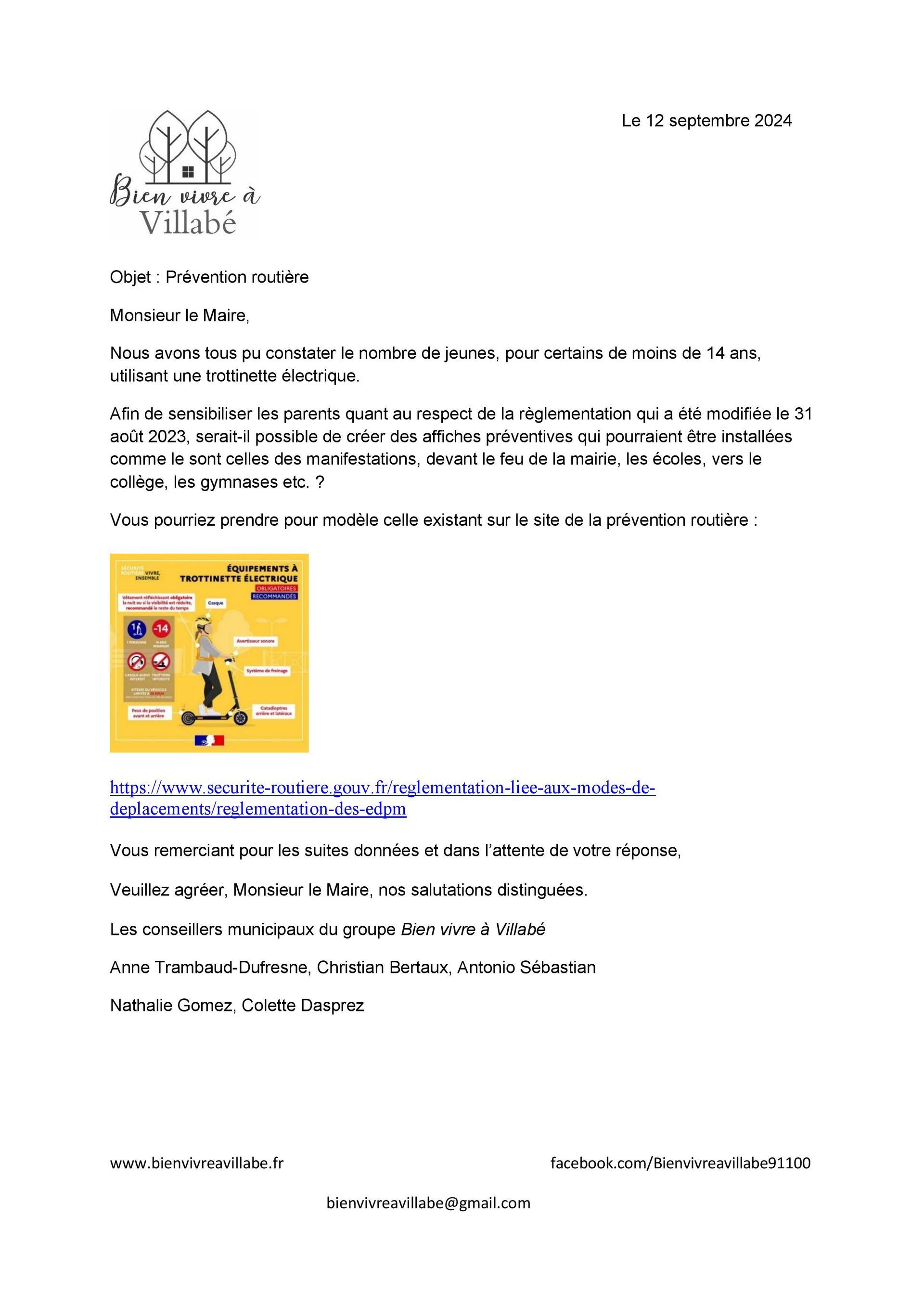 Prévention routière … réponse du maire à notre proposition de création d’affiches préventives pour sensibiliser les parents quant au respect de la règlementation concernant les trottinettes électriques :