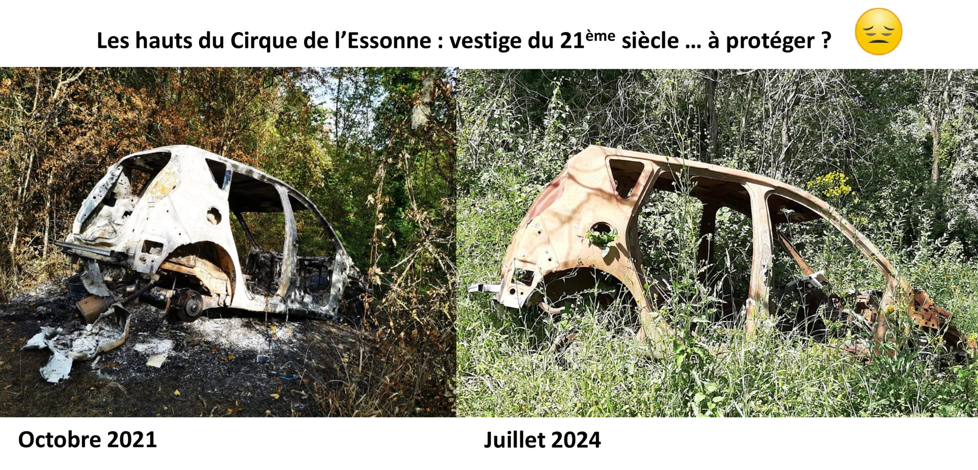 Octobre 2021, une voiture brûlée dans les hauts du cirque de l’Essonne ; juillet 2024, elle est toujours au même endroit …
