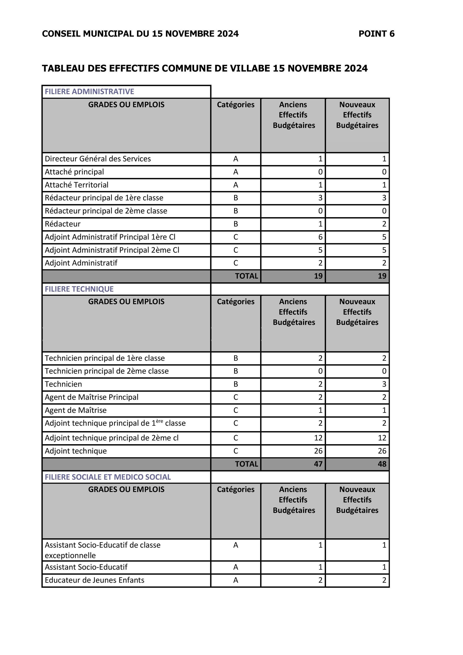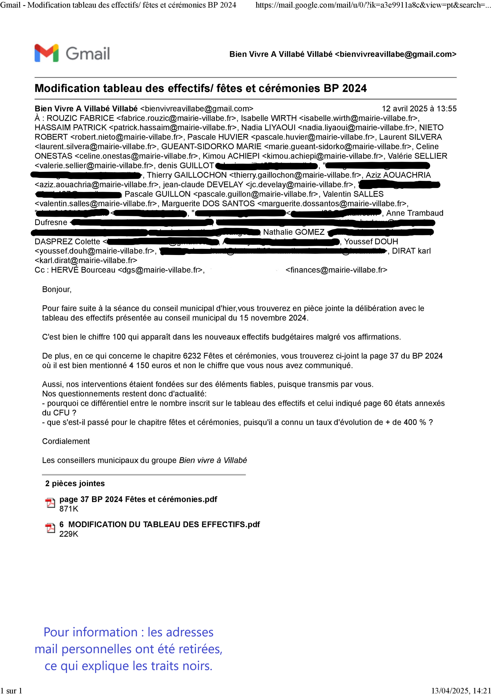 Les réponses étaient d’un tel aplomb que cela pouvait faire douter …après tout, l’erreur est humaine. Cependant les élus de Bien vivre à Villabé ont par la suite recherché les documents et il s’avère qu’ils ont raison. Ils ont donc envoyé un message avec le tableau des effectifs communiqué pour le conseil municipal de novembre 2024 et la page du budget primitif 2024 correspondant aux crédits votés.(documents ci-dessous)