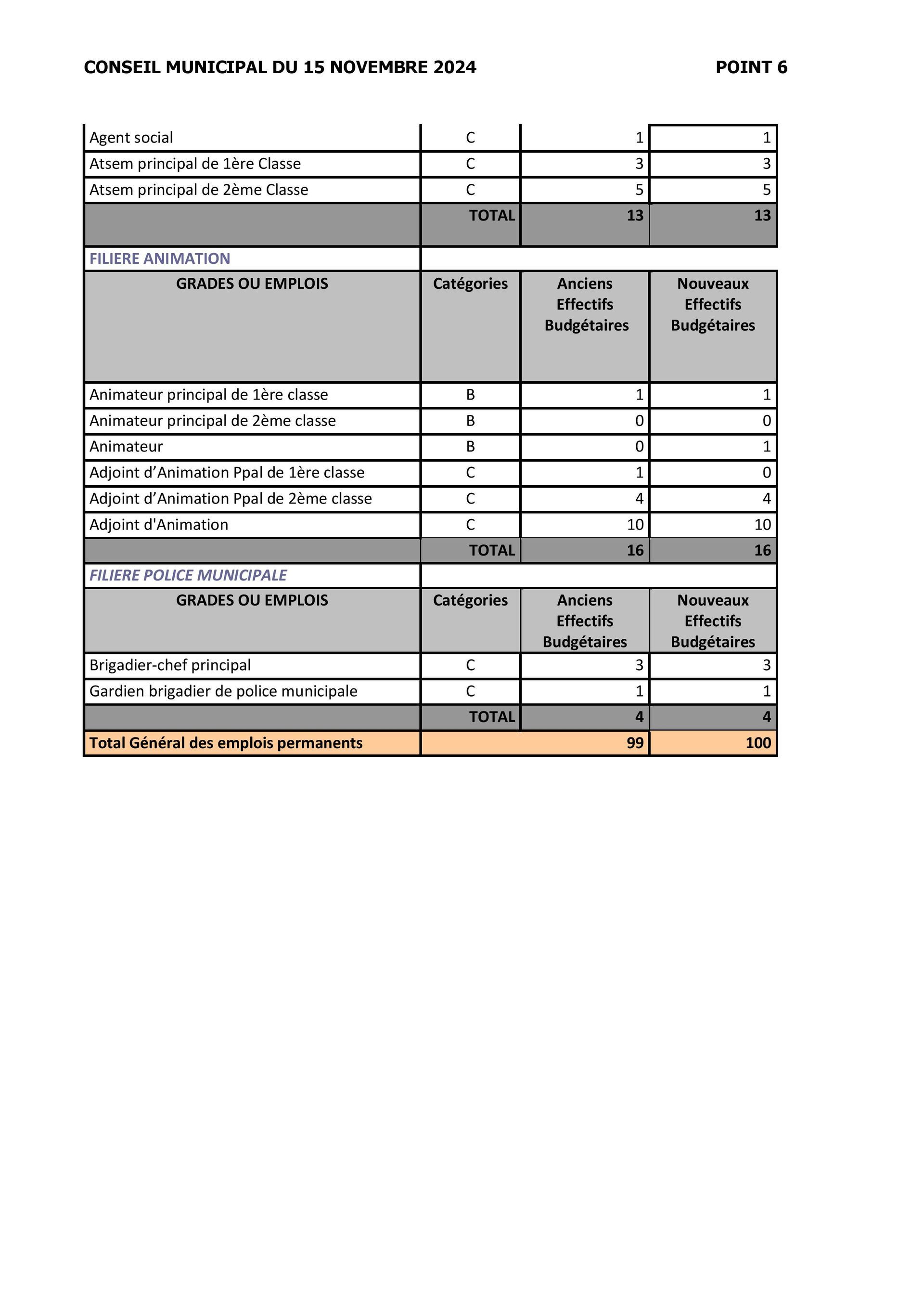 2) En rapport avec l’état du personnel municipal où sont indiqués 95 emplois budgétaires, notre groupe a questionné ce qu’il en était réellement d’autant qu’un tableau des effectifs avait été présenté au conseil municipal le15 novembre 2024 dans lequel était écrit 100 emplois budgétaires.
