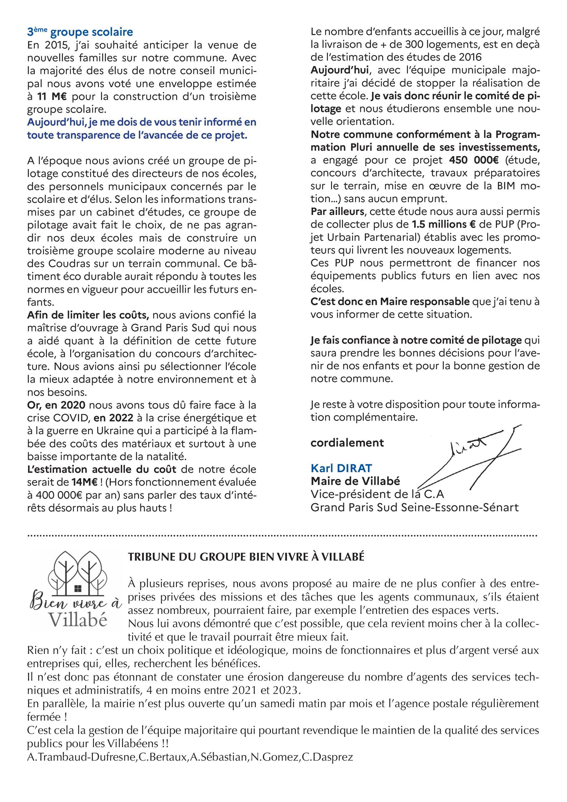 Le maire a écrit dans sa lettre d’octobre 2023 distribuée à tous les Villabéens, à propos du 3ème groupe scolaire :