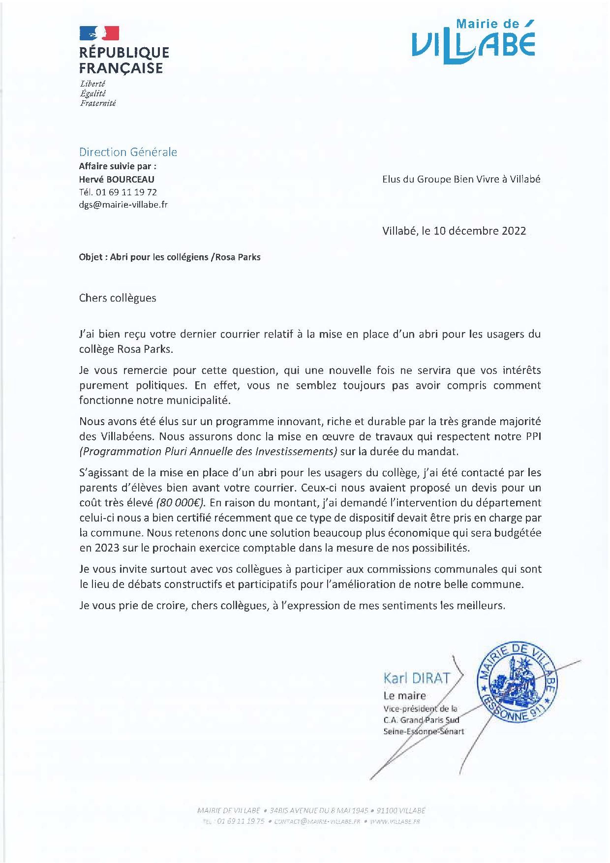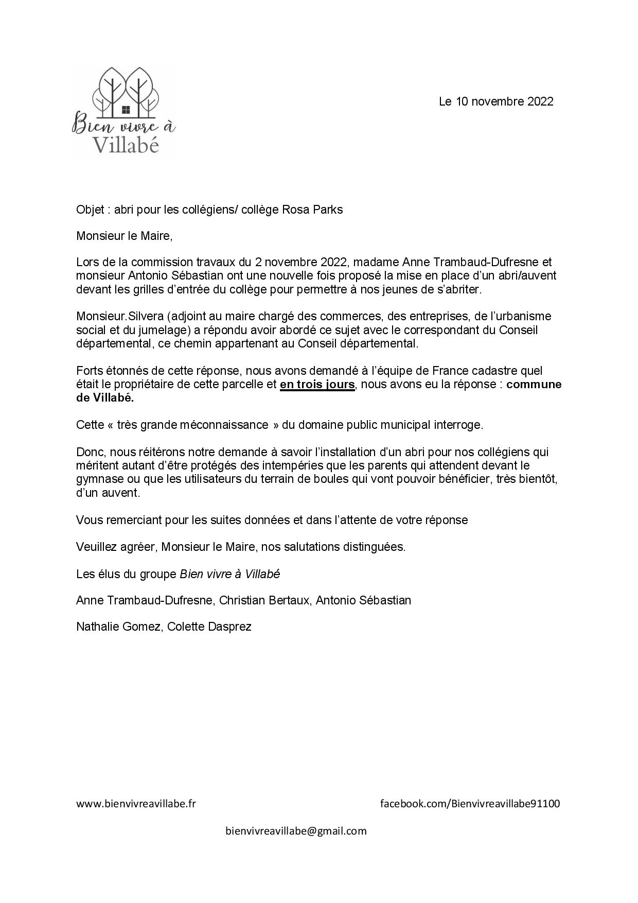 Les conseillers municipaux ont donc adressé un courrier au maire pour qu’enfin, maintenant que l’on sait à qui appartient ce chemin, notre demande soit entendue et que nos collégiens puissent s’abriter.