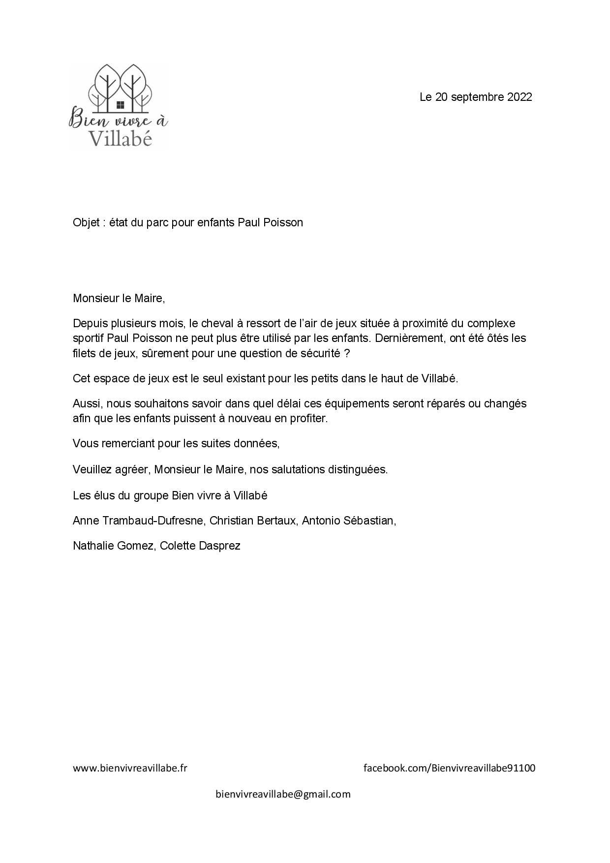 Parce que nous nous soucions du bien être de nos enfants, et que nous avons constaté une dégradation de l’aire de jeux située à proximité du gymnase Paul Poisson, nous avons adressé ce courrier au maire: