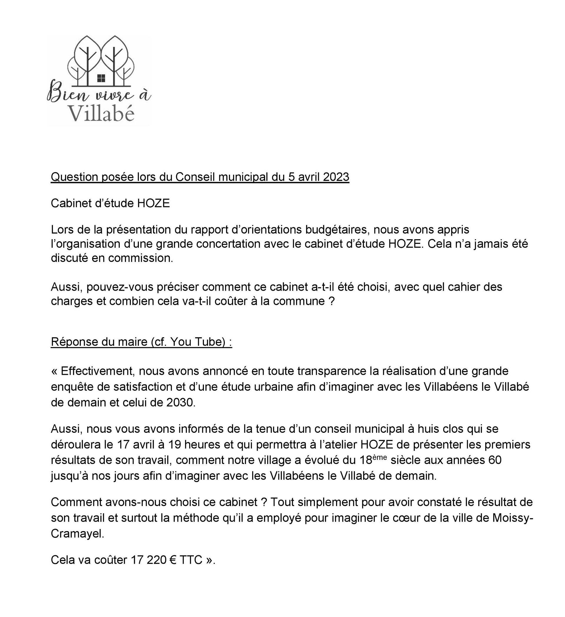 Conseil municipal du 5 avril 2023: Une question sur l’intervention du Cabinet HOZE dans le cadre d’une grande concertation des Villabéens et une réponse du maire claire et précise.