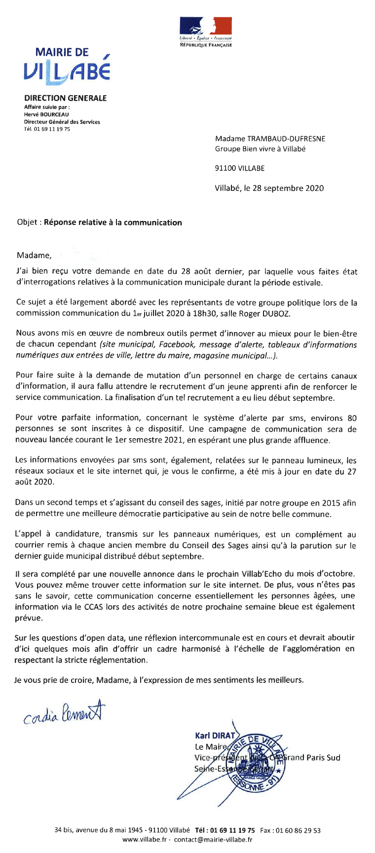 Une réponse nous a été apportée : « soyez rassuré, le site officiel de Villabé a été mis à jour le 27 août et les informations envoyées par sms sont également relatées sur ce site. La difficulté rencontrée faisait suite au départ d’un personnel. Or depuis septembre 2020, un jeune apprenti a été recruté pour renforcer le service communication ».