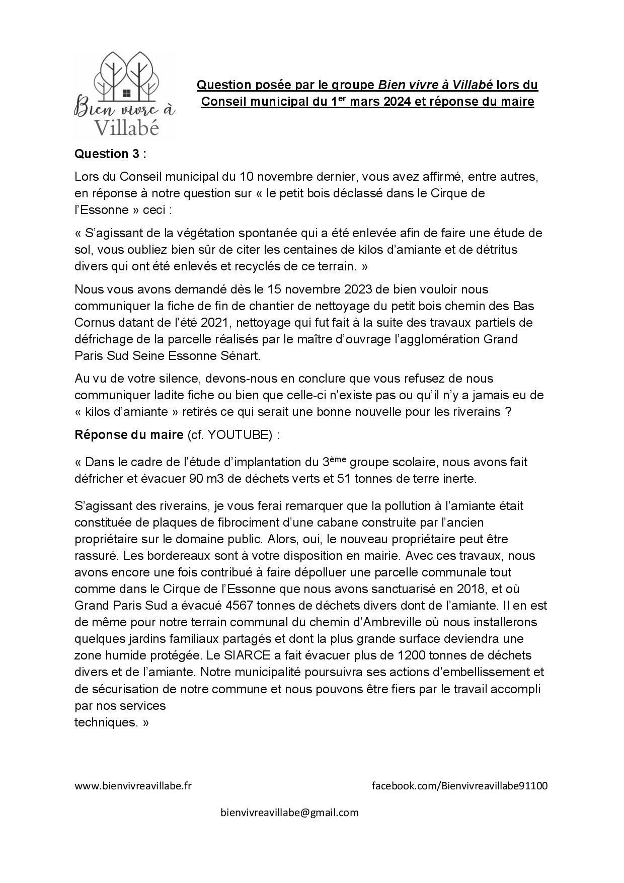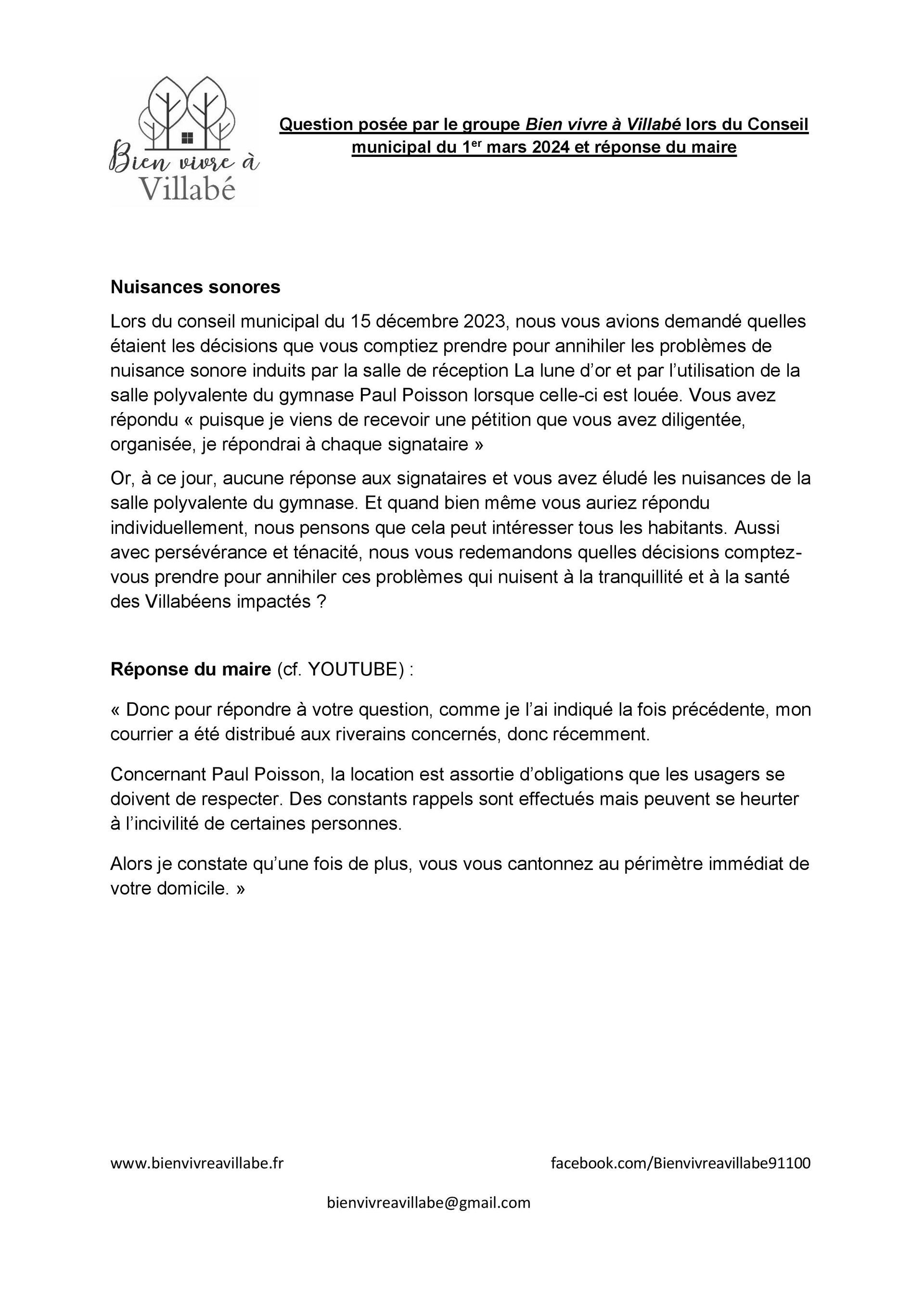 Pour la Lune d’or, nous précisons que la réponse a été distribuée la veille du conseil municipal et que les questions sont envoyées trois jours avant le conseil municipal. Est-ce un hasard ? De plus, sa mise en demeure est loin d’être efficace puisque le jeudi 7 mars, il a fallu requérir une nouvelle fois les forces de l’ordre pour faire cesser les « boums-boums » qui perturbaient la nuit de Villabéens.