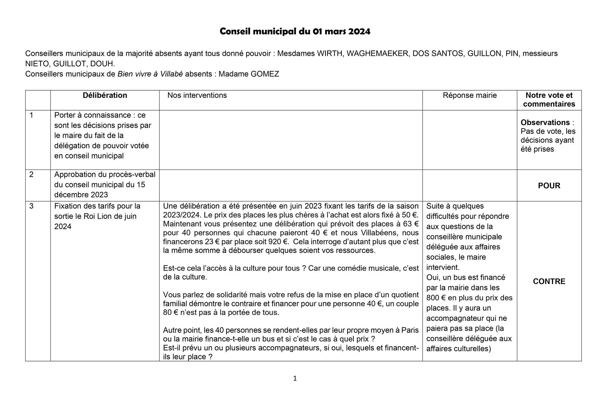 Cette sortie coûtera à chaque participant 40 € puisque les 23 € restant seront financés par les deniers publics villabéens. Et, ce qui n’avait pas été énoncé dans cette délibération, c’est le financement du bus qui d’après le maire serait aux alentours de 800 €.