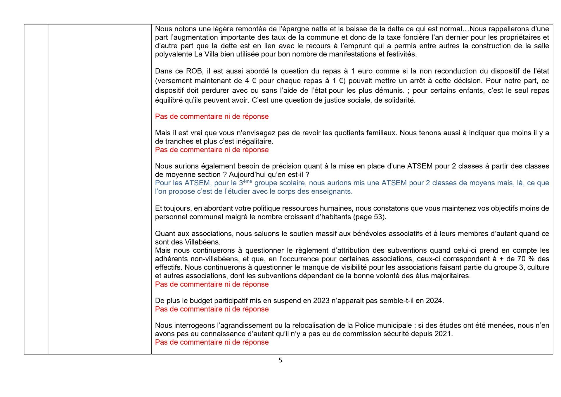 Un Rapport d’objectif budgétaire a été débattu. Il fut préparé de façon unilatérale, ce qui n’est pas nouveau. Mais ce qui l’est plus, c’est que cette année, le plan pluriannuel d’investissement n’a pas été présenté de façon détaillée. C’est une première ! Donc, vous ne saurez pas, par exemple, si l’auvent pour les collégiens a été budgété…