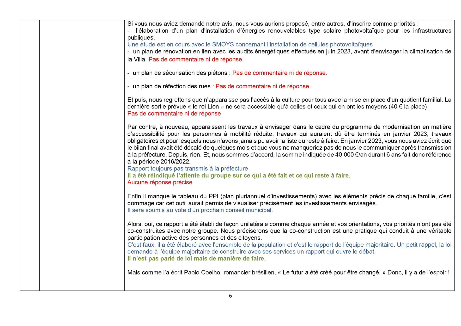 Enfin, les non -réponses du maire, la non communication des éléments demandés prétextant qu’il revient aux conseillers municipaux de se déplacer en mairie interroge, une nouvelle fois, sur sa conception de l’accès aux documents et donc sa vision de la démocratie.