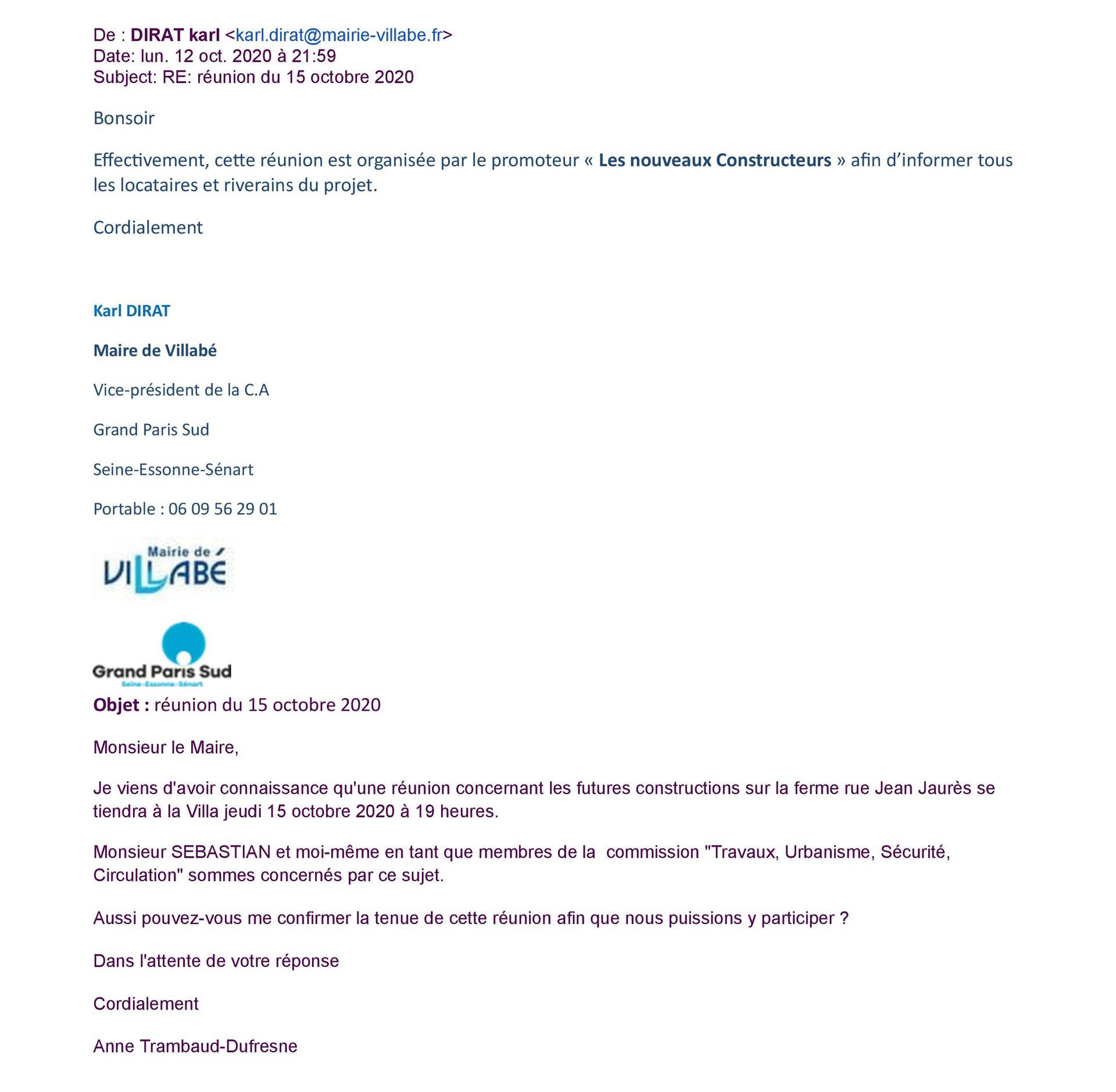 Non, les nouveaux constructeurs en accord avec l’équipe municipale majoritaire avaient décidé de ne convier que les habitants de la ferme, la petite entreprise Sport Carbone et les riverains donc pas d’invitation à l’ensemble de la population ! (voir ci-dessous échange de mail du 12 octobre 2020)