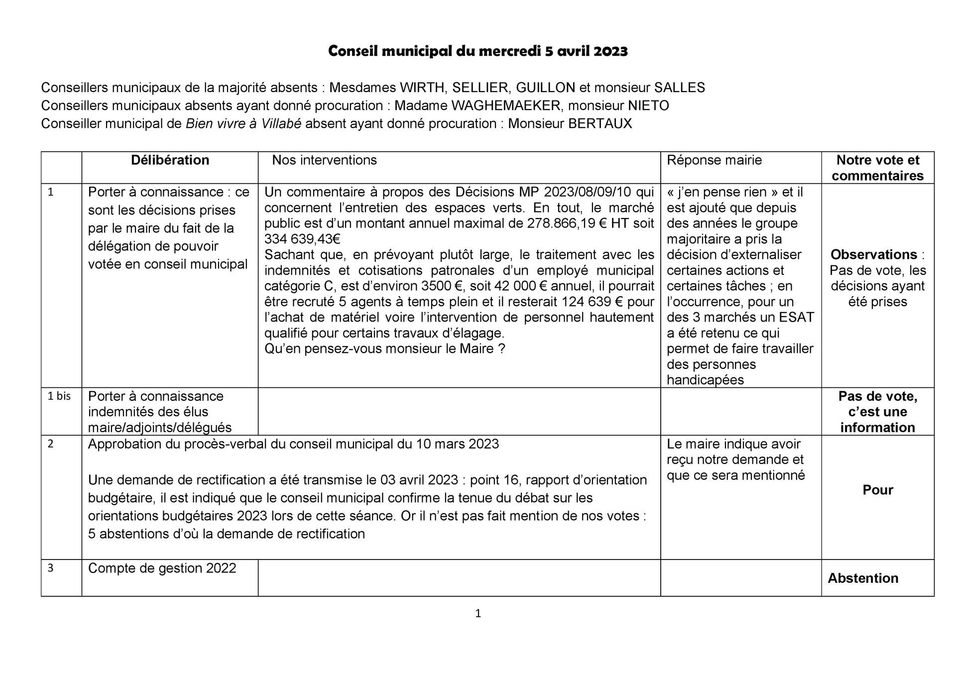 Les conseillers municipaux de Bien vivre à Villabé demandent au maire ce qu’il pense de cette proposition : le recrutement de 5 agents à temps plein et il resterait de l’argent pour l’achat du matériel voire l’intervention de personnel hautement qualifié pour certains travaux d’élagage.