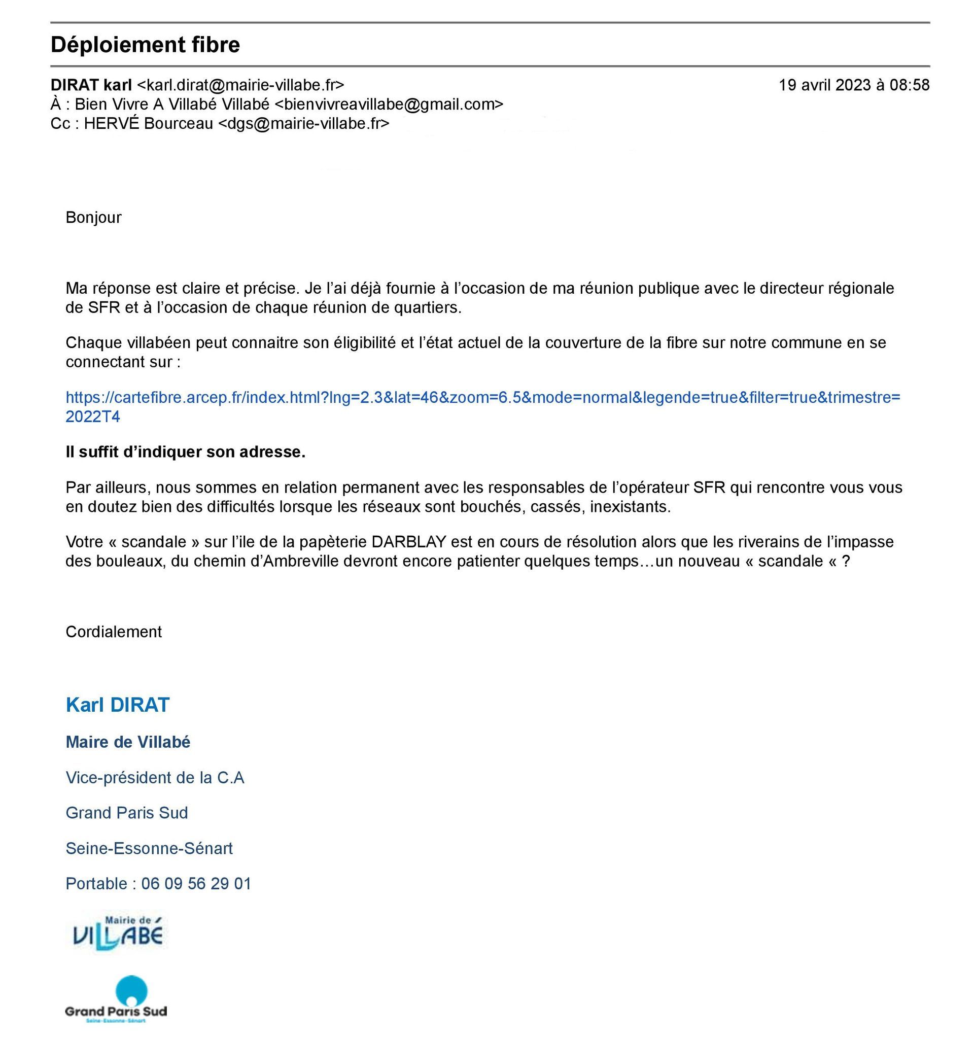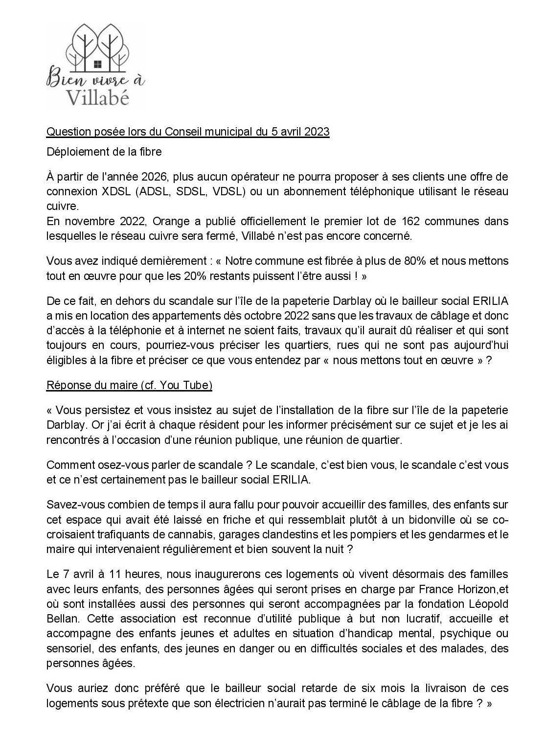 Le maire n’a pas apprécié que nous fassions référence au « scandale sur l’île de la papeterie Darblay où le bailleur social ERILIA a mis en location des appartements dès octobre 2022 sans que les travaux de câblage et donc d’accès à la téléphonie et à internet ne soient faits, travaux qu’il aurait dû réaliser et qui sont toujours en cours »