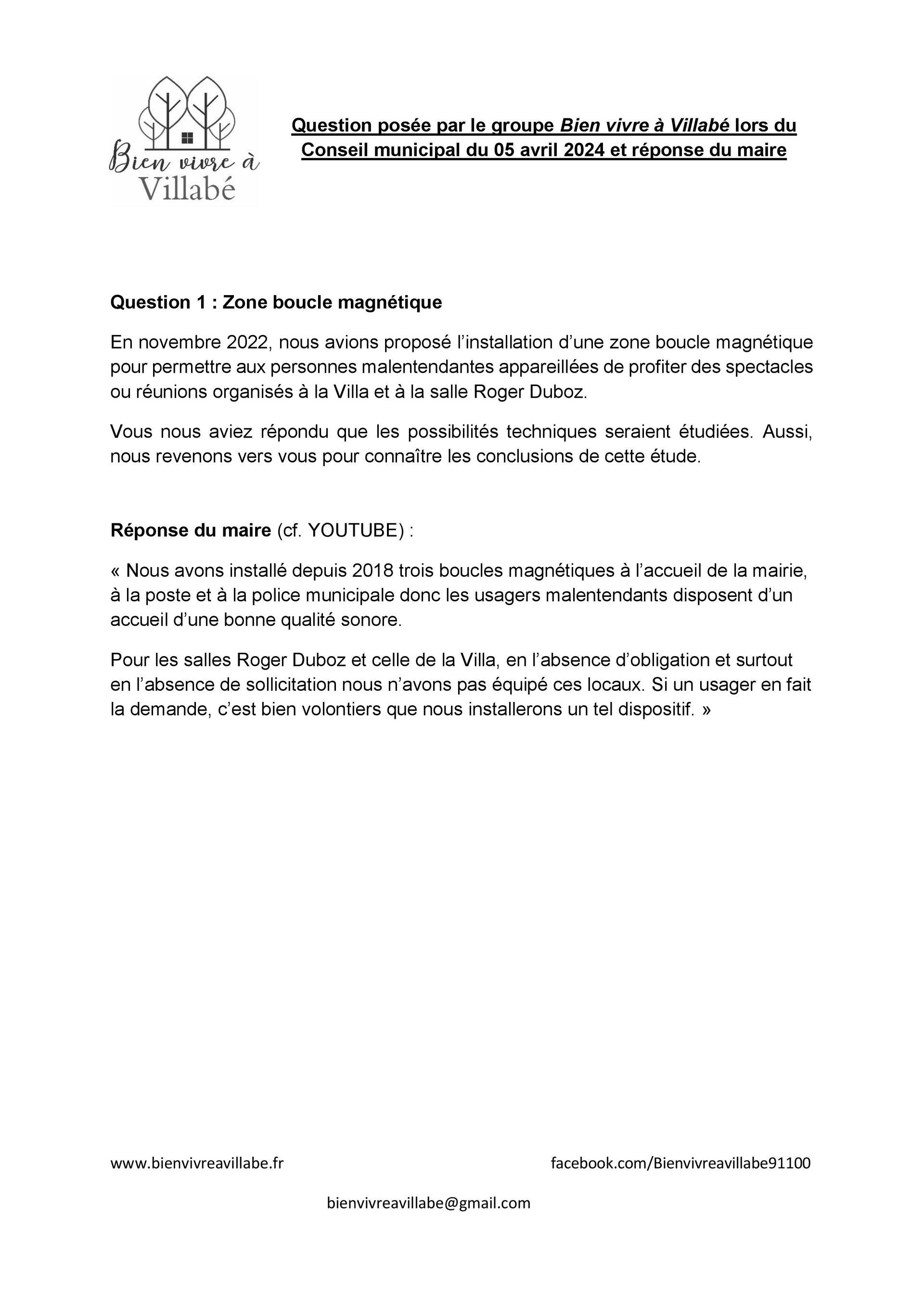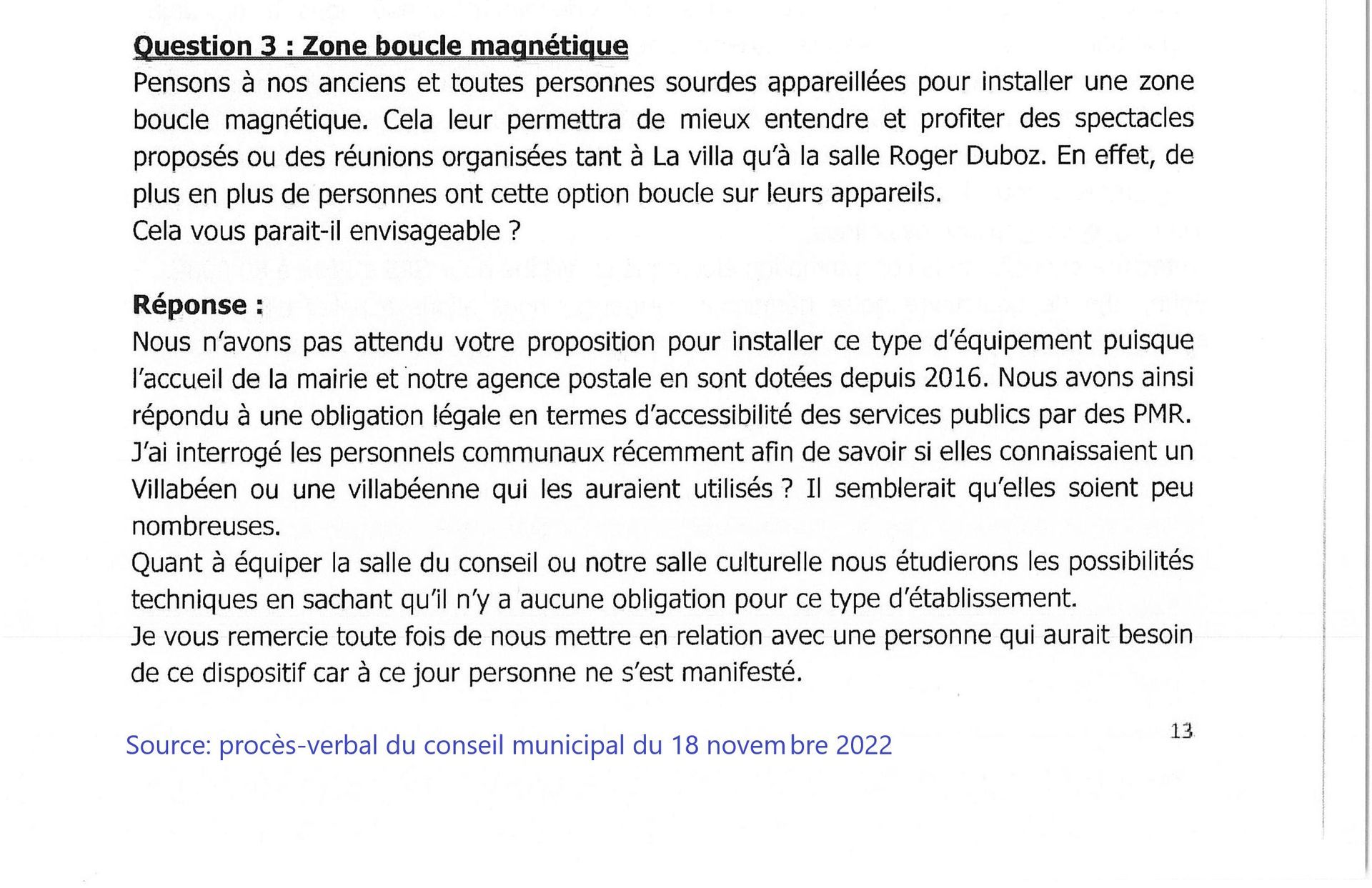 Si nous avons demandé en 2022 l’installation d’une boucle d’induction magnétique salle Roger Duboz et à la Villa, c’est pour permettre aux personnes malentendantes appareillées de profiter des animations/spectacles et de participer aux réunions en bénéficiant d’une qualité auditive. Le maire a dans un premier temps répondu « nous étudierons les possibilités techniques … »