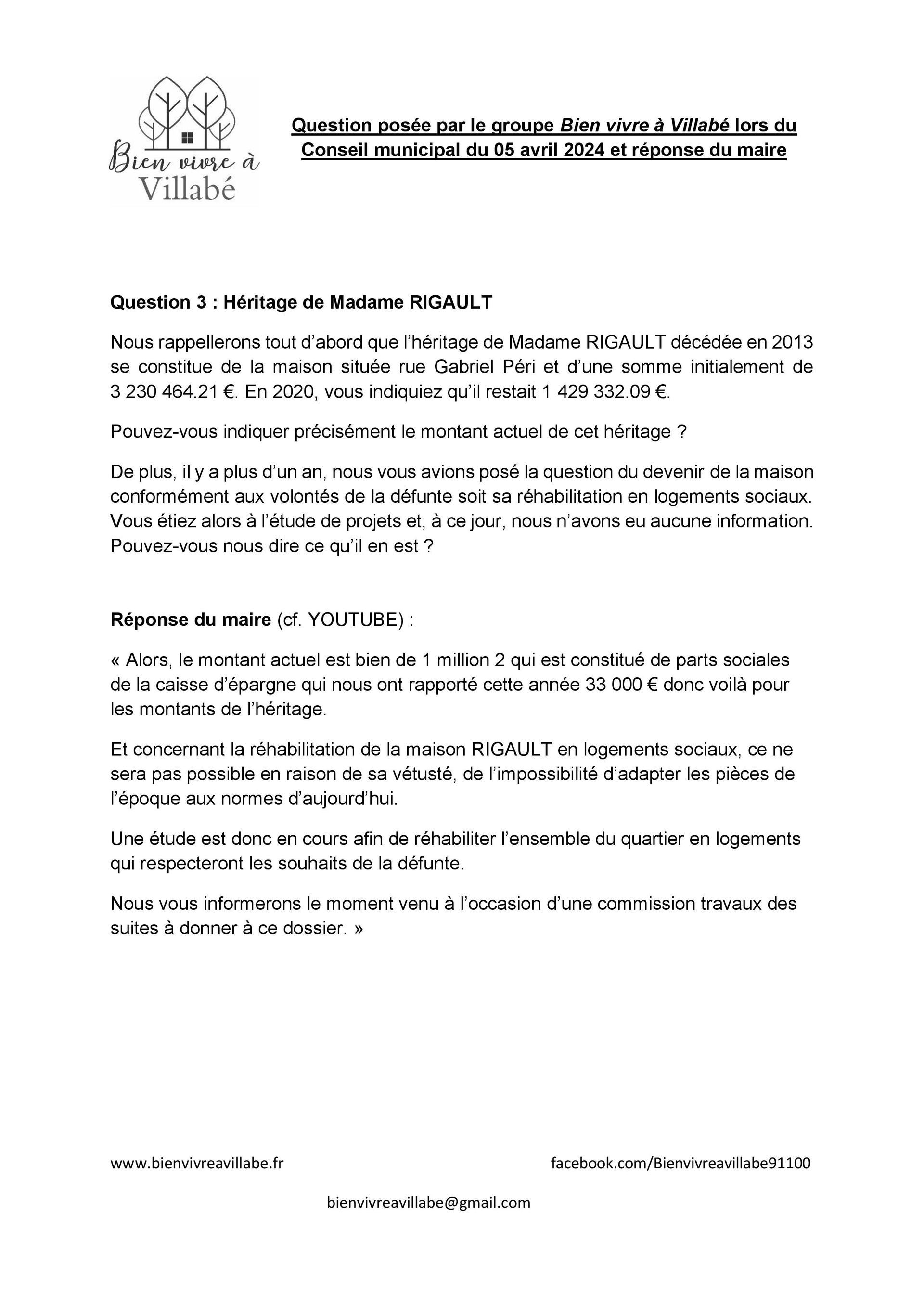 Donc, en mars 2023, les conseillers municipaux de Bien vivre à Villabé ont demandé au maire les actions prévues pour la réhabilitation de cette bâtisse, en proposant de possibles solutions via SNL (Solidarités Nouvelles pour le logement), ou SOLHIA (solidaires pour l’habitat), en lien avec l’ADIL (agence départementale d’information pour le logement). Il répondra « …nous sommes encore à l’étude d’autres projets… » (Cf. Procès-Verbal du 10 mars 2023) et tiendra pour responsable le groupe de Bien vivre à Villabé de la non réalisation du projet de réhabilitation.