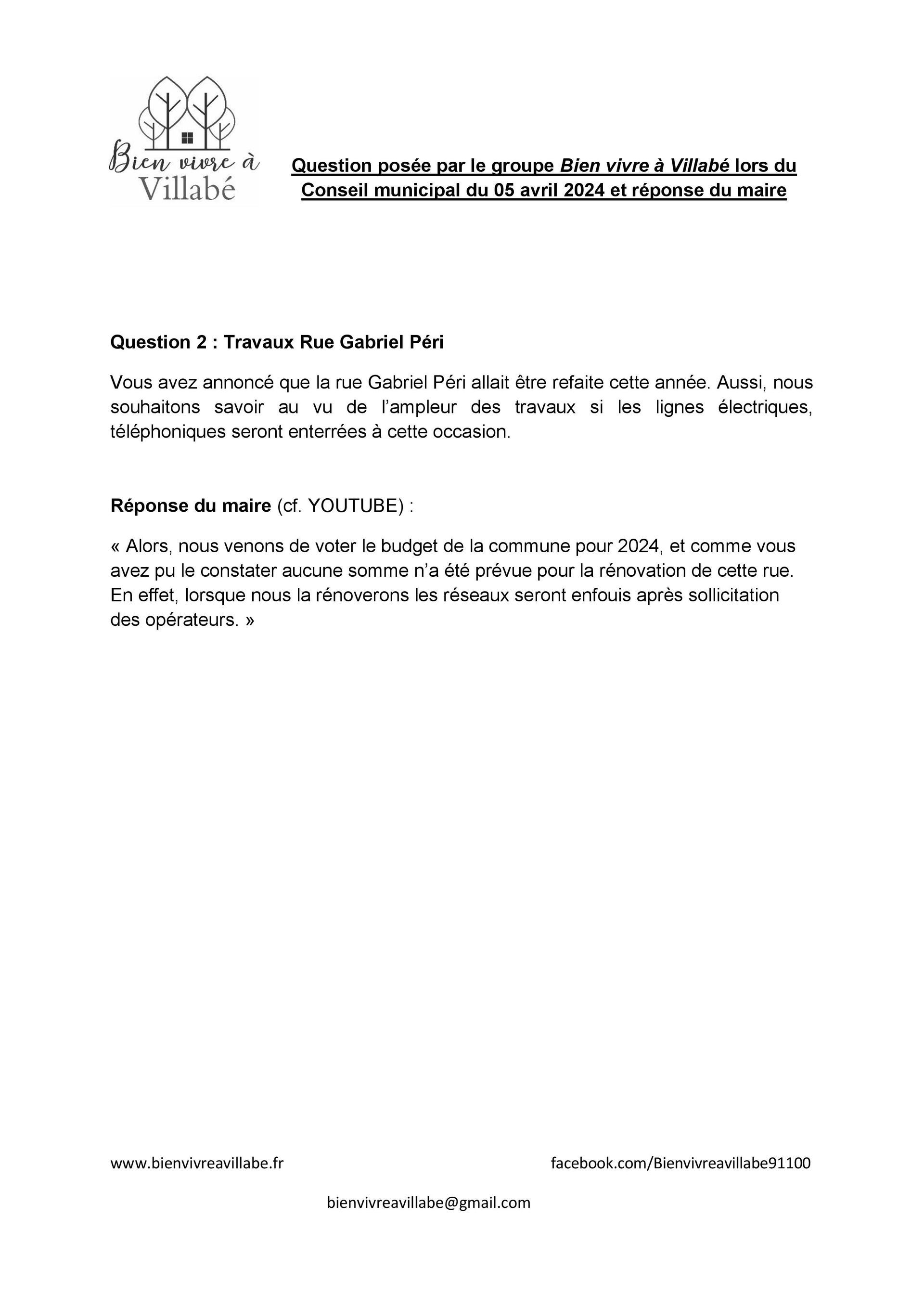 « Nous souhaiterions bien sûr poursuivre dans toutes les rues de Villabé cependant nous n'avons pas retenu ce projet dans notre programmation pluriannuelle des investissements pour le moment en raison de son coût élevé et de chantiers plus urgents. »