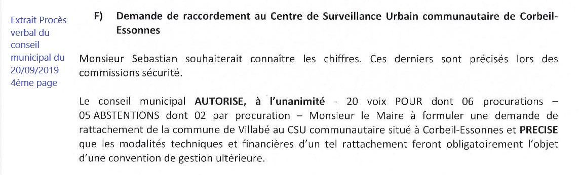 Pourtant en septembre 2019, le conseil municipal avait délibéré sur une demande de raccordement à ce centre appelé alors centre de supervision communautaire et déjà à l’époque il était précisé que les modalités techniques et financières feraient obligatoirement l’objet d’une convention de gestion ultérieure. (Voir photo)