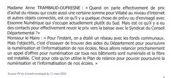 En mars 2022 les conseillers municipaux de Bien vivre à Villabé avaient demandé si un rapprochement avec « Essonne numérique » était envisagé pour réduire les frais de connexion de la collectivité.
