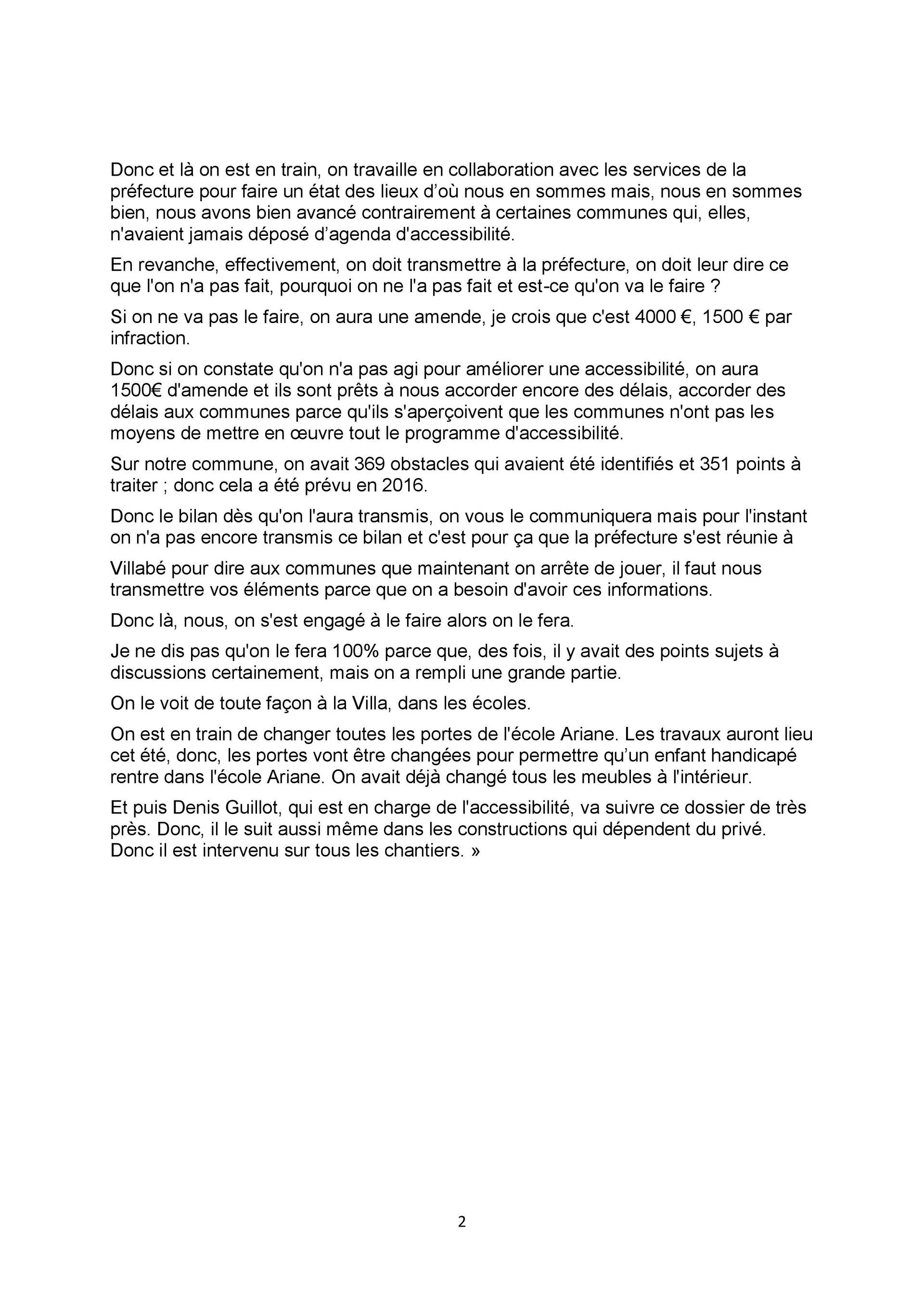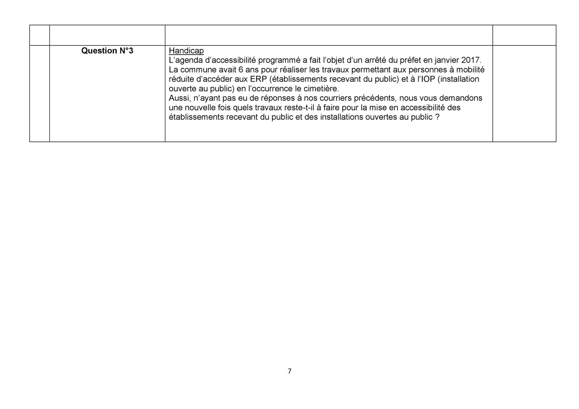 Une question simple : quels travaux reste-t-il à faire pour la mise en accessibilité des établissements recevant du public et des installations ouvertes au public (cimetière) sachant qu’un agenda d’accessibilité programmé a fait l’objet d’un arrêté en janvier 2017 et que la commune avait 6 ans pour réaliser les travaux ?