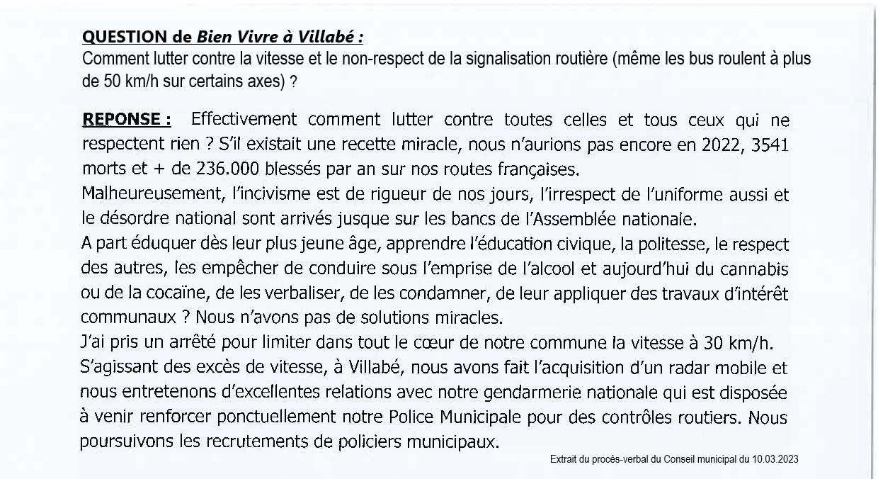 Réponse du maire : il a pris un arrêté pour limiter dans tout le cœur de Villabé la vitesse à 30 km/h