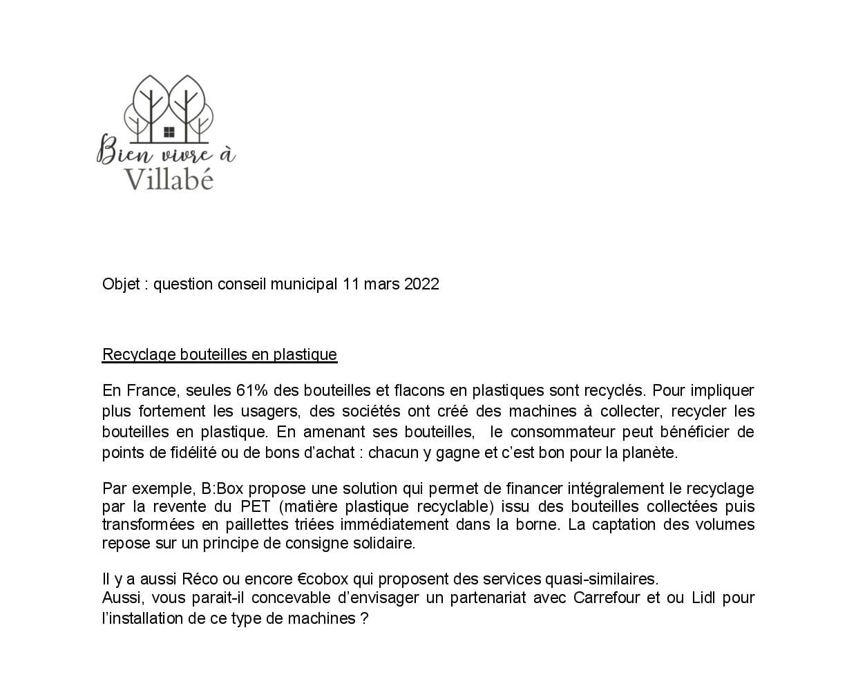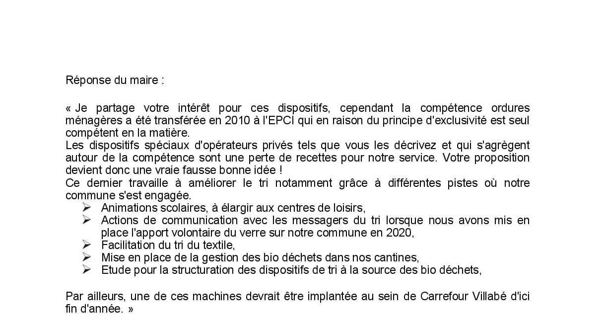 Bien vivre à Villabé propose au maire d’envisager un partenariat avec Carrefour ou Lidl pour installer une machine à recycler les bouteilles ou flacons en plastique contre des points fidélité, bons d’achats pour impliquer plus fortement les consommateurs dans le tri.