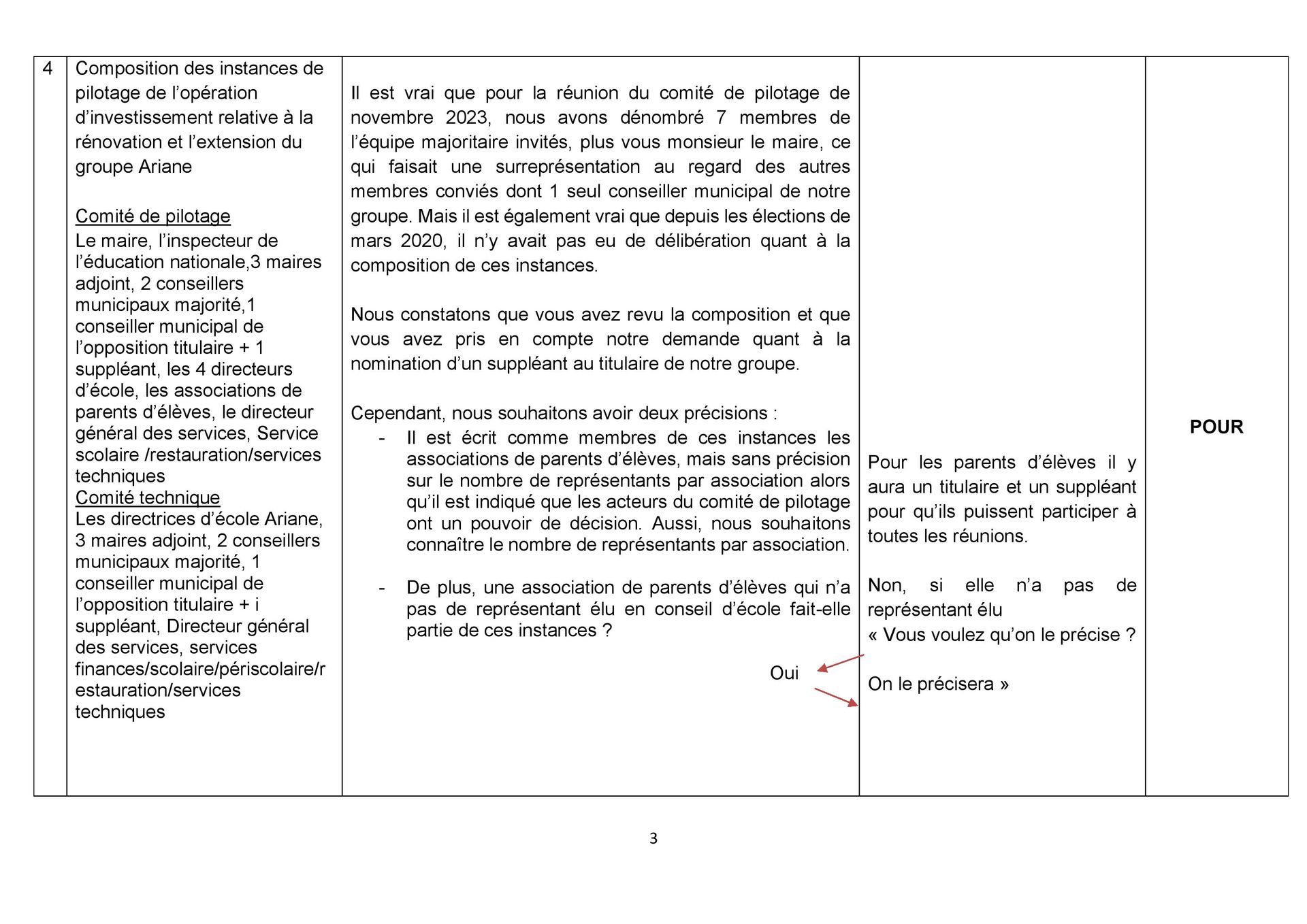 Le maire a revu la composition. Il y avait auparavant 7 membres de l’équipe majoritaire plus lui et 1 conseiller municipal de notre groupe. Maintenant ils sont 5 + le maire et nous avons en sus un suppléant. C’est déjà cela !