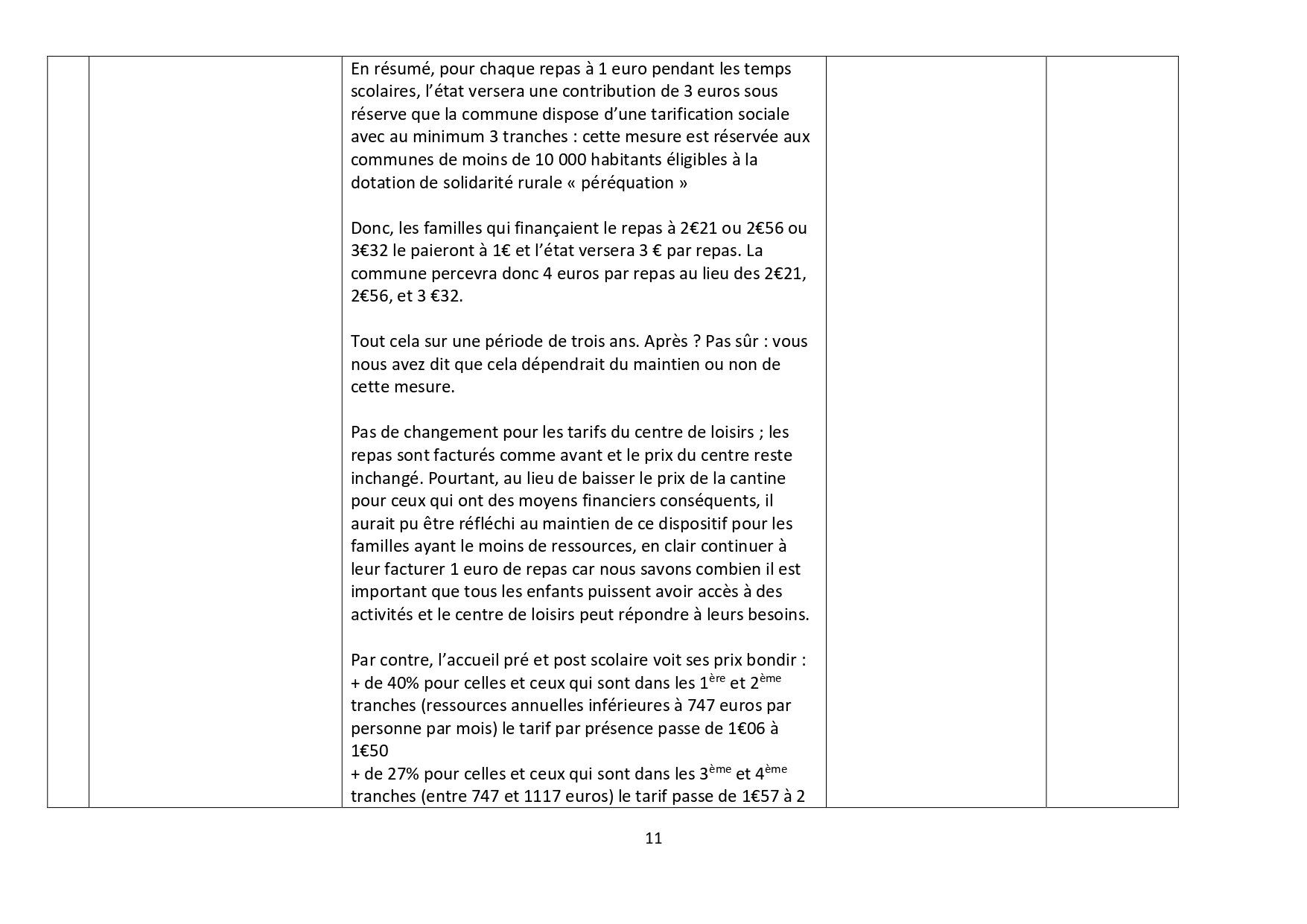Par contre l’accueil pré et post scolaire voit ses prix bondir : + de 40% d’augmentation pour les familles les plus modestes, le tarif passe de 1,06€ à 1,50€, et des augmentations pour les autres tranches.