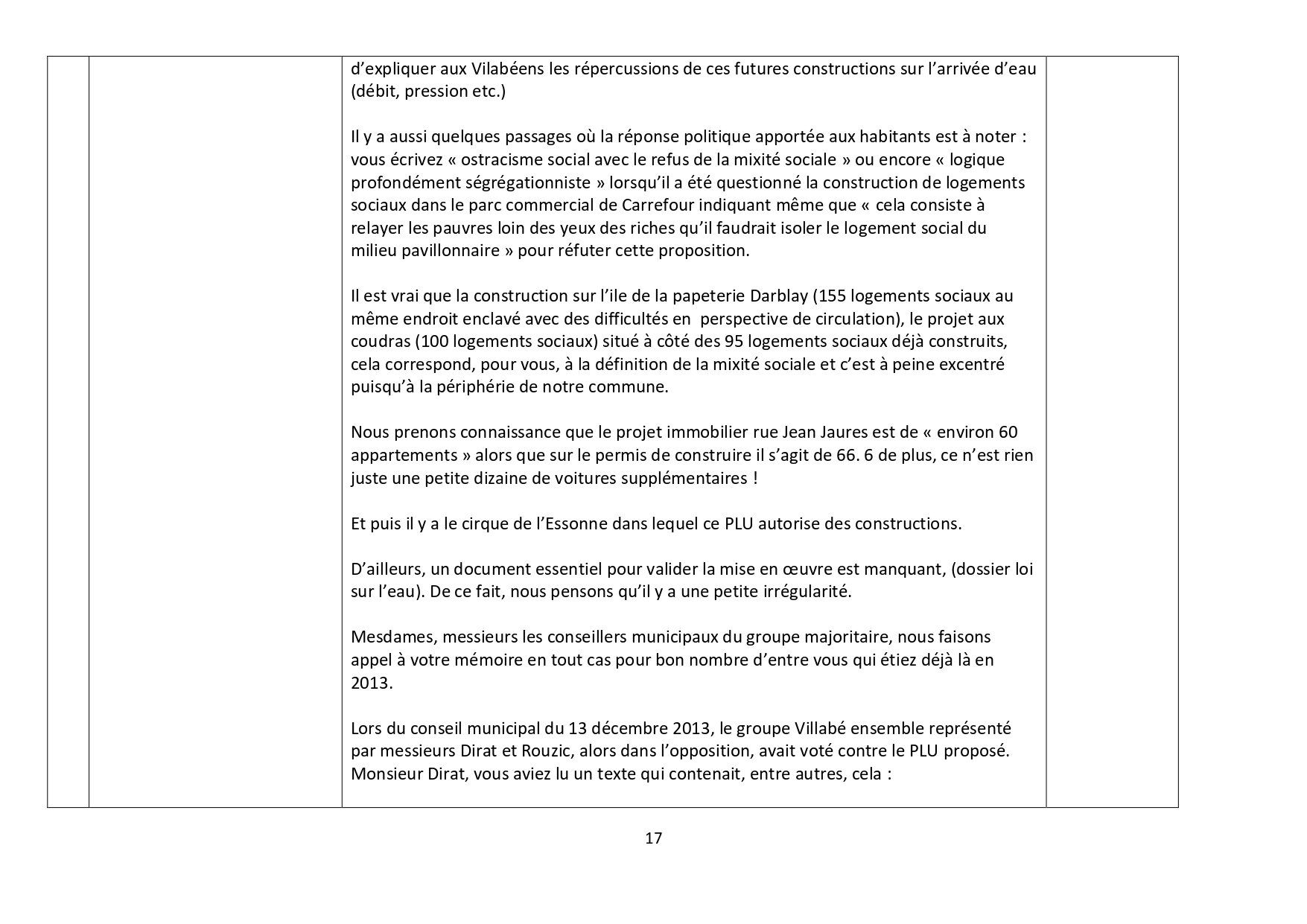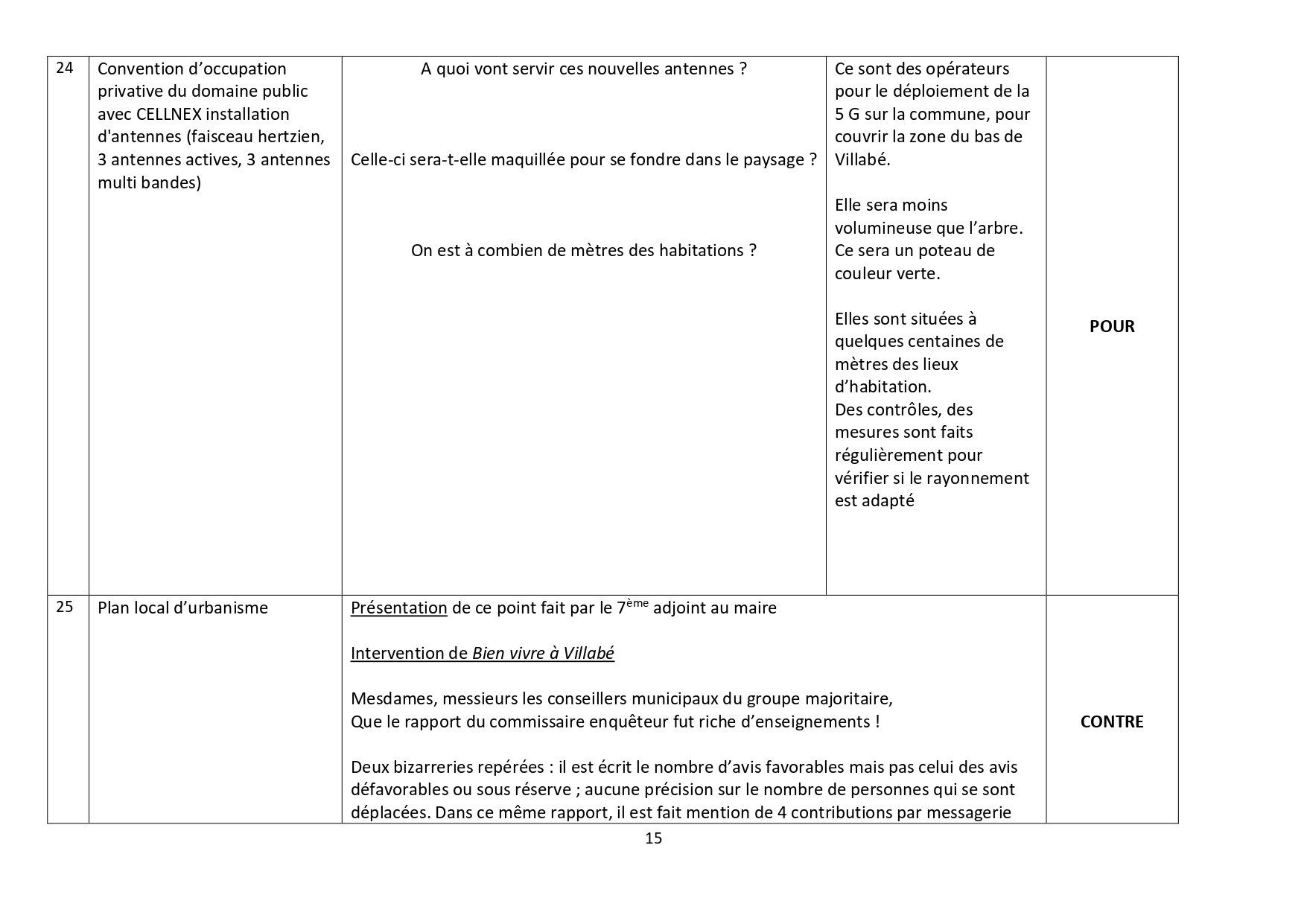 Et puis, il y a eu le point 25, le plan local d’urbanisme qui fut adopté à la majorité, les élus de Bien vivre à Villabé ont voté contre, avec des interventions qui n’ont pas été enregistrées (micro fermé) et comme d’habitude aucun débat, aucune intervention des autres conseillers municipaux hormis leurs applaudissements après le vote.