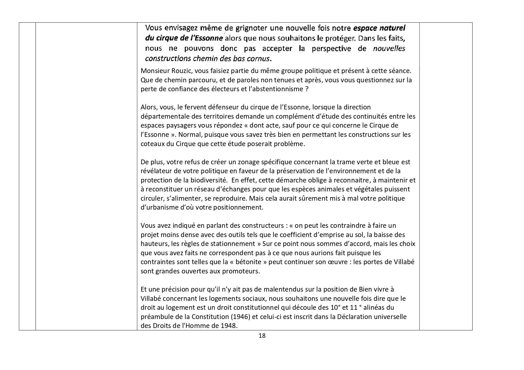 D’ailleurs, il fut un temps où messieurs Dirat et Rouzic, alors dans l’opposition, se sont opposés au PLU proposé en 2013 par l’ancienne équipe municipale en disant cela : « Vous envisagez même de grignoter une nouvelle fois notre espace naturel du cirque de l’Essonne alors que nous souhaitons le protéger. Dans les faits nous ne pouvons pas accepter la perspective de nouvelles constructions chemin des bas cornus. »